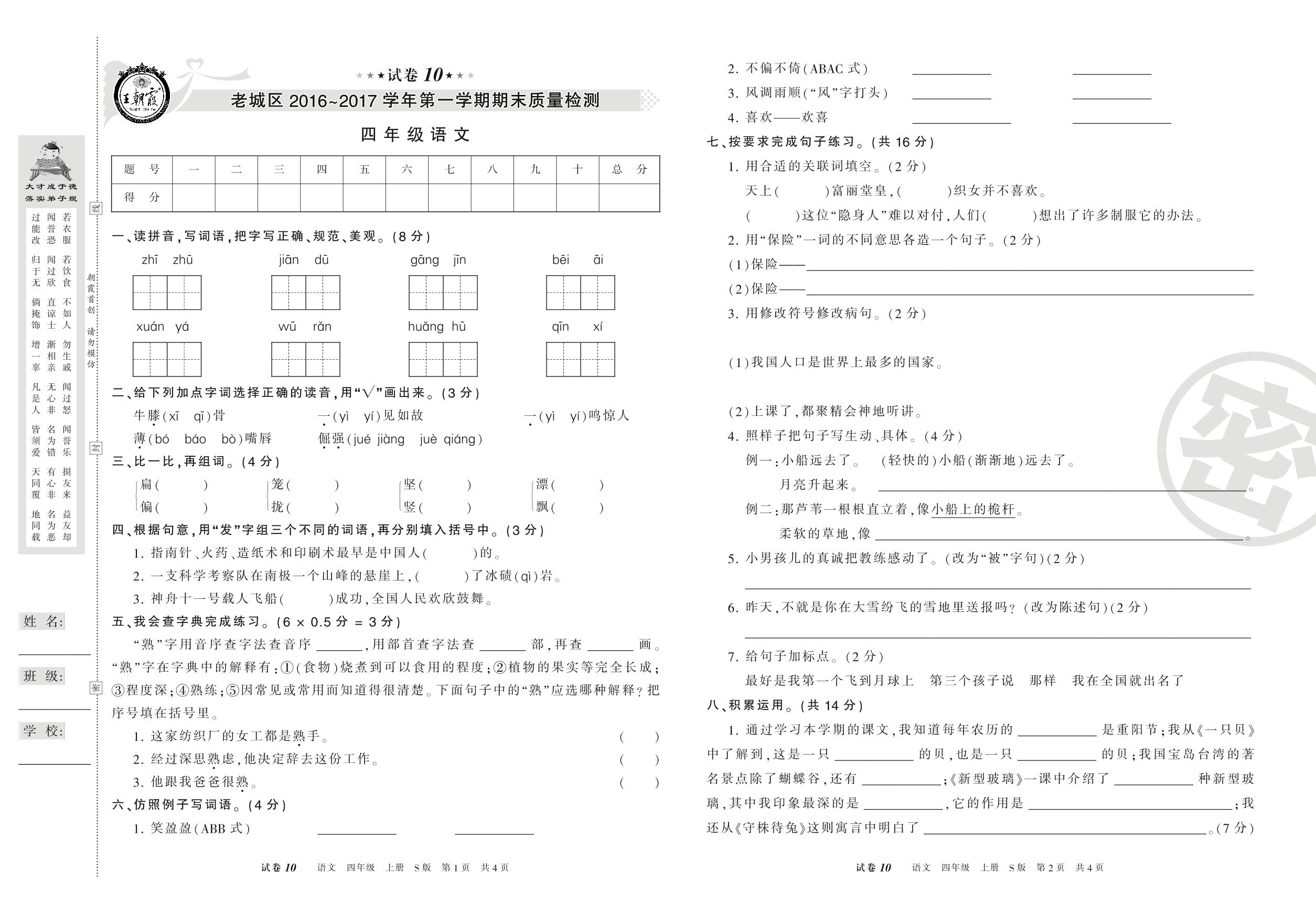 2016-2017学年第一学期洛阳市老城区四年级语文试卷(S版)【10】