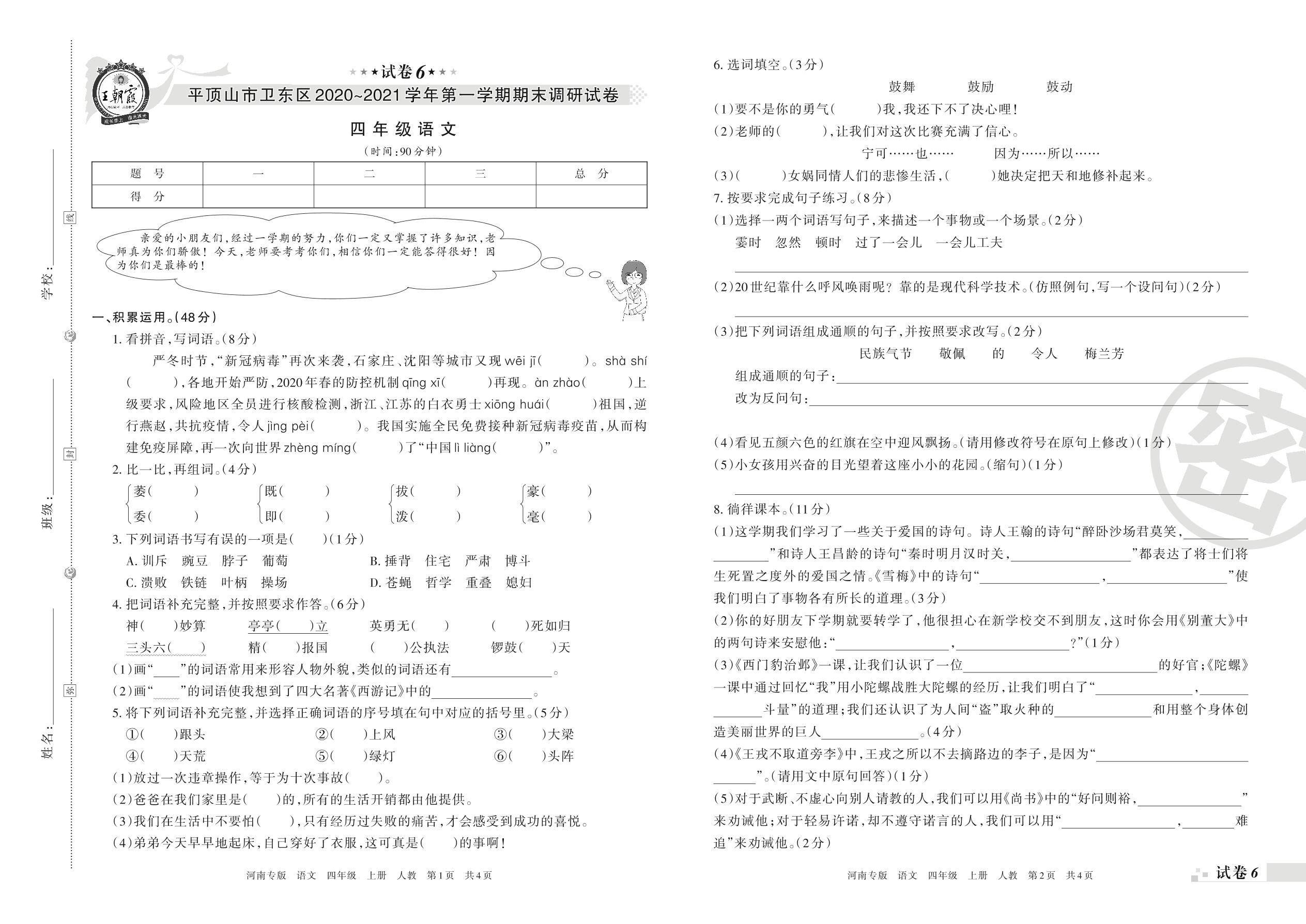 平顶山市卫东区2020~2021学年第一学期期末调研试卷四年级语文(人教版)【6】