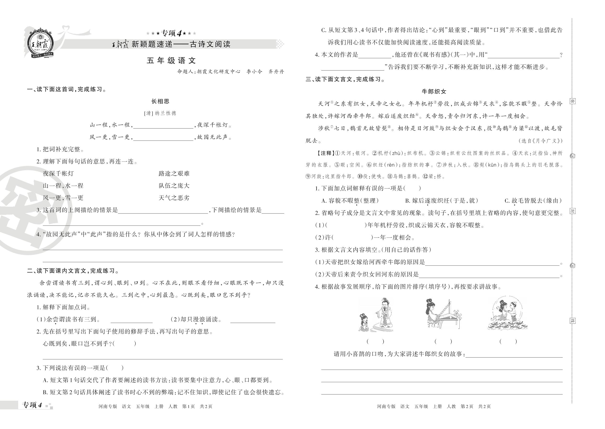 王朝霞期末专项卷——新颖题速递:古诗文阅读五年级上册语文(人教版)_R211225173000725【4】