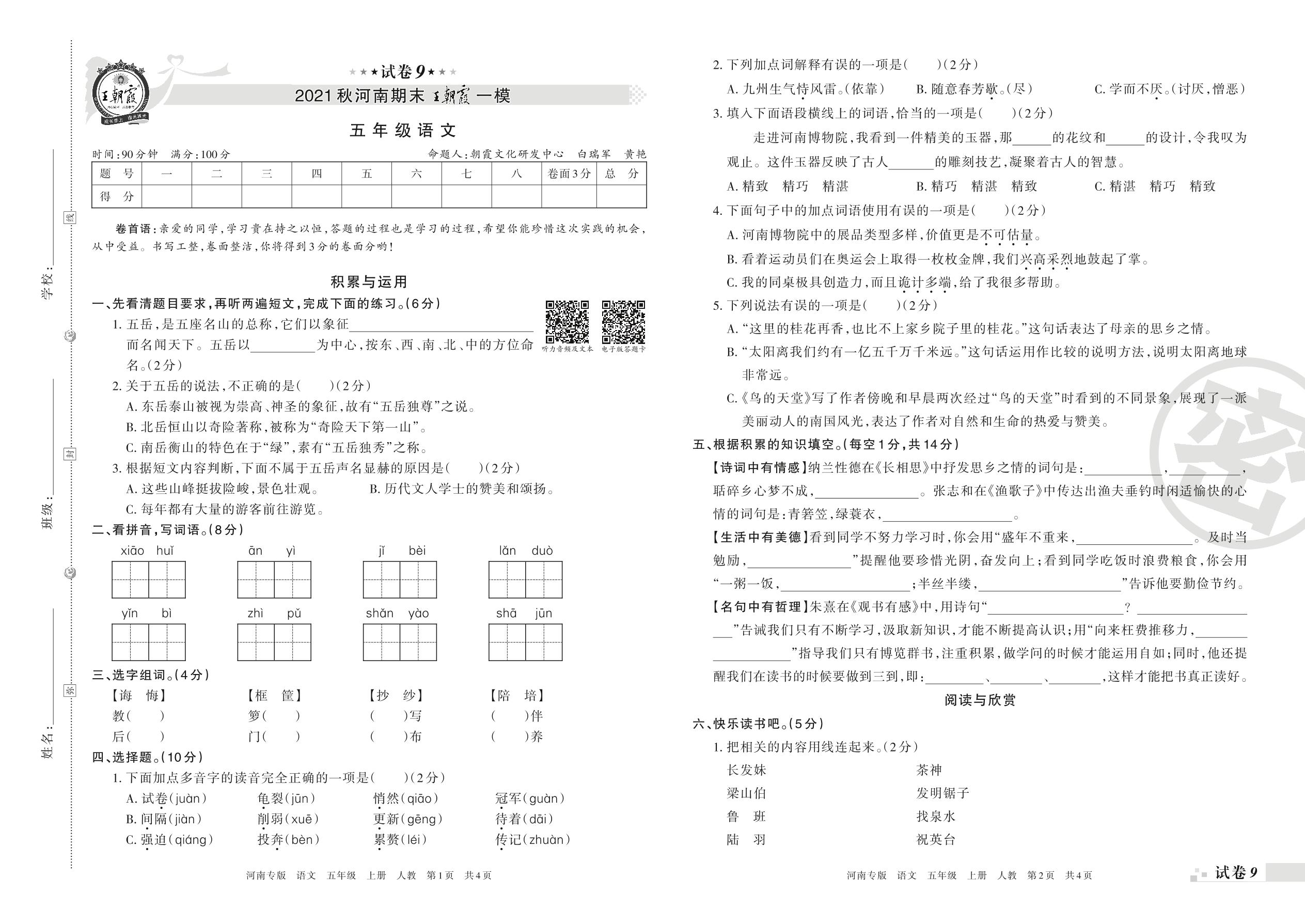 王朝霞期末模拟卷五年级上册语文(人教版)_R211225173000039【9】