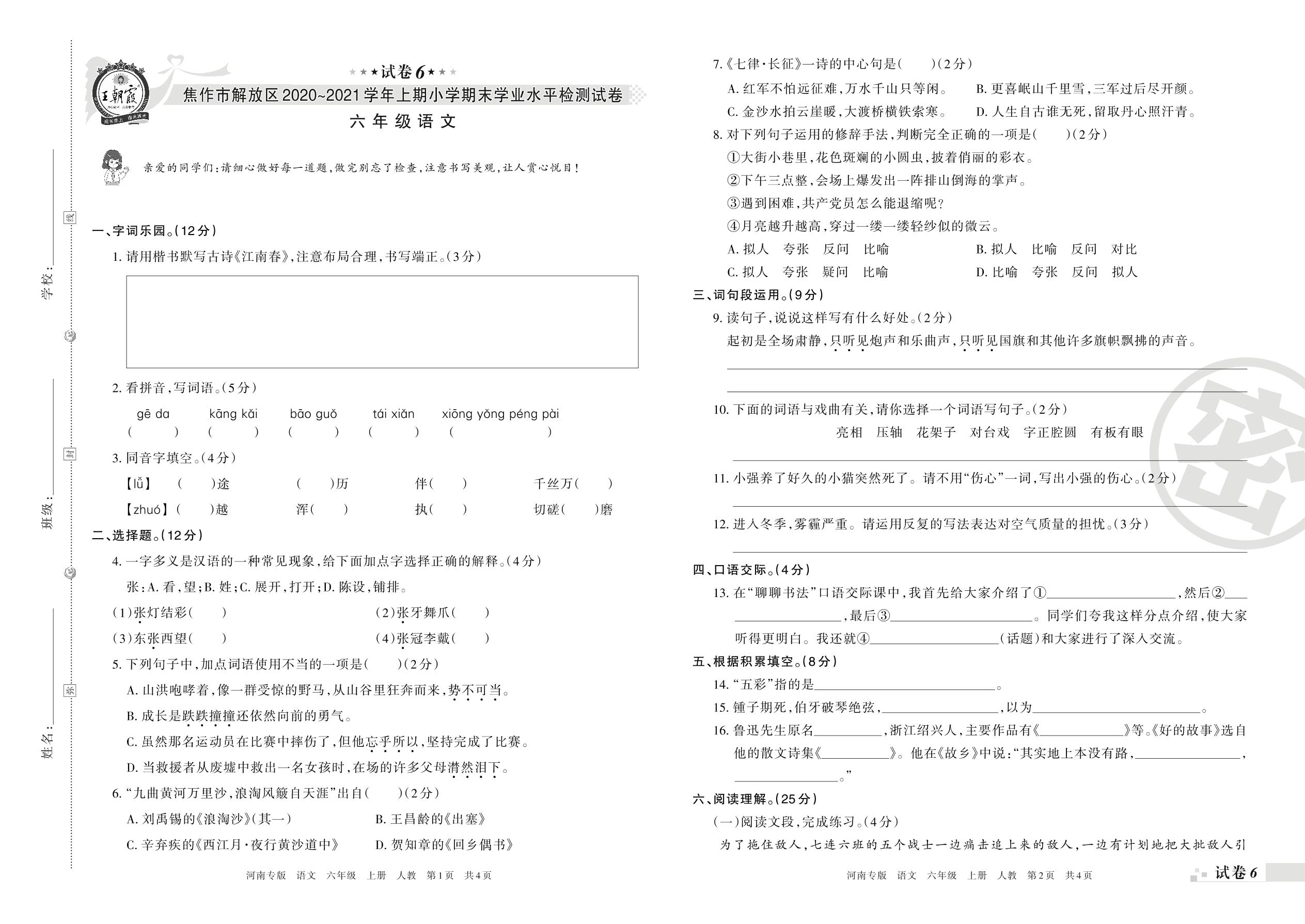 焦作市解放区2020~2021学年上期小学期末学业水平检测试卷六年级语文人教版【6】