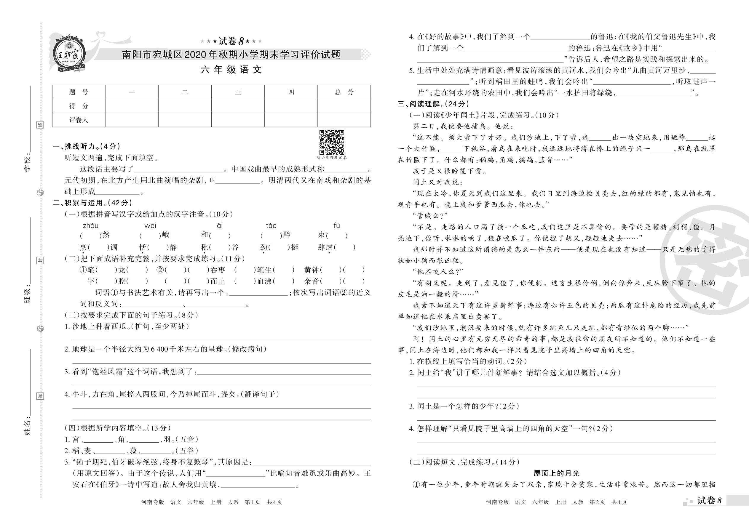 南阳市宛城区2020年秋期小学期末学习评价试题六年级语文人教版【8】