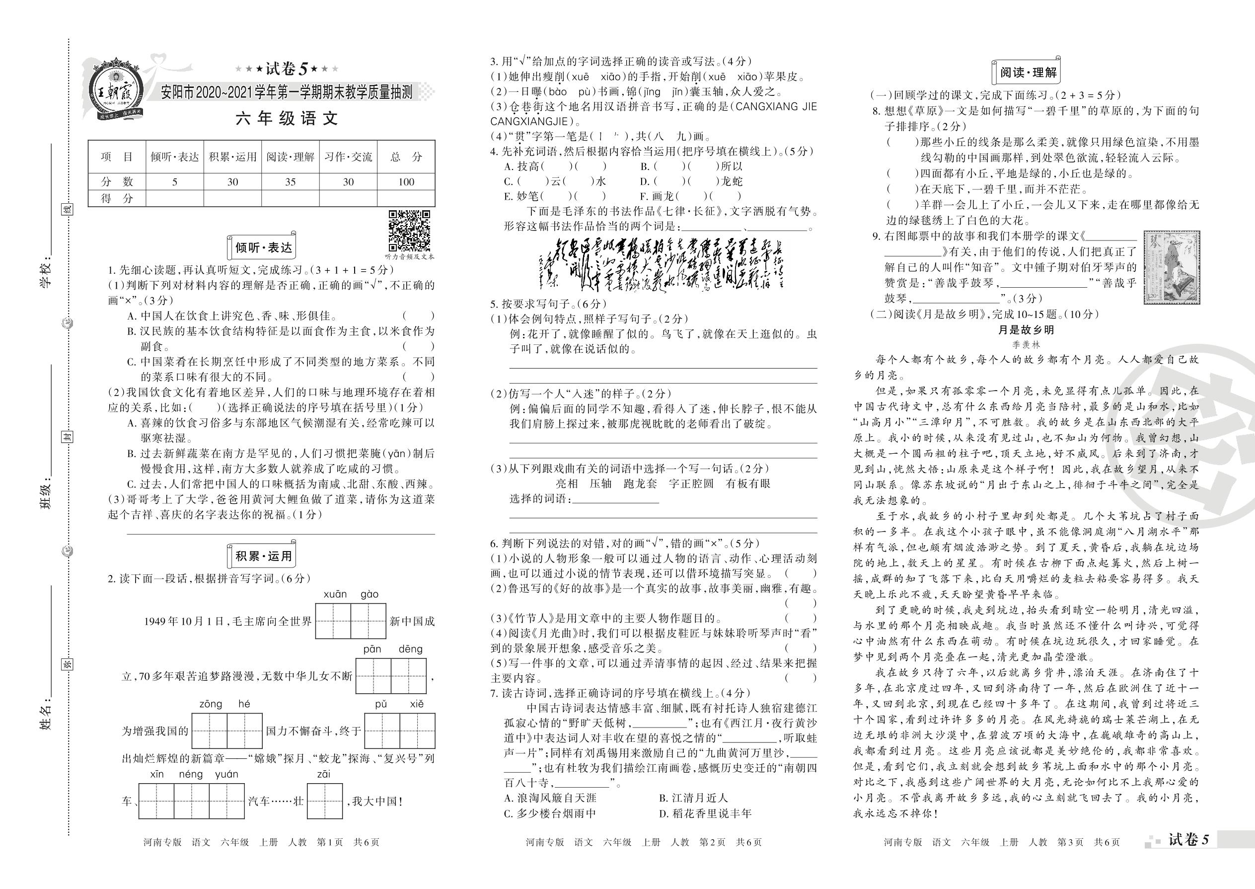 安阳市2020~2021学年第一学期期末教学质量抽测六年级语文人教版【5】