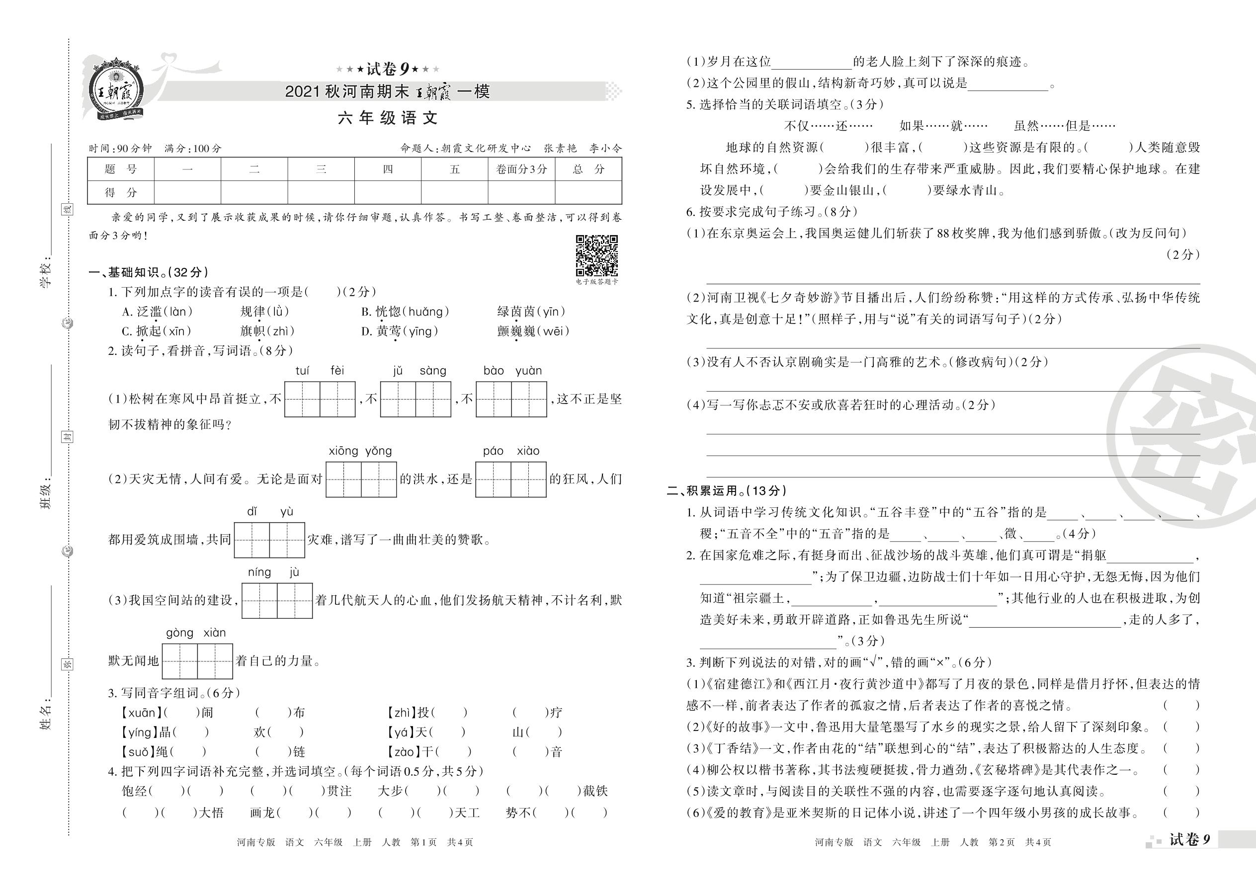 王朝霞期末模拟卷六年级上册语文(人教版)_R211225175212172【9】