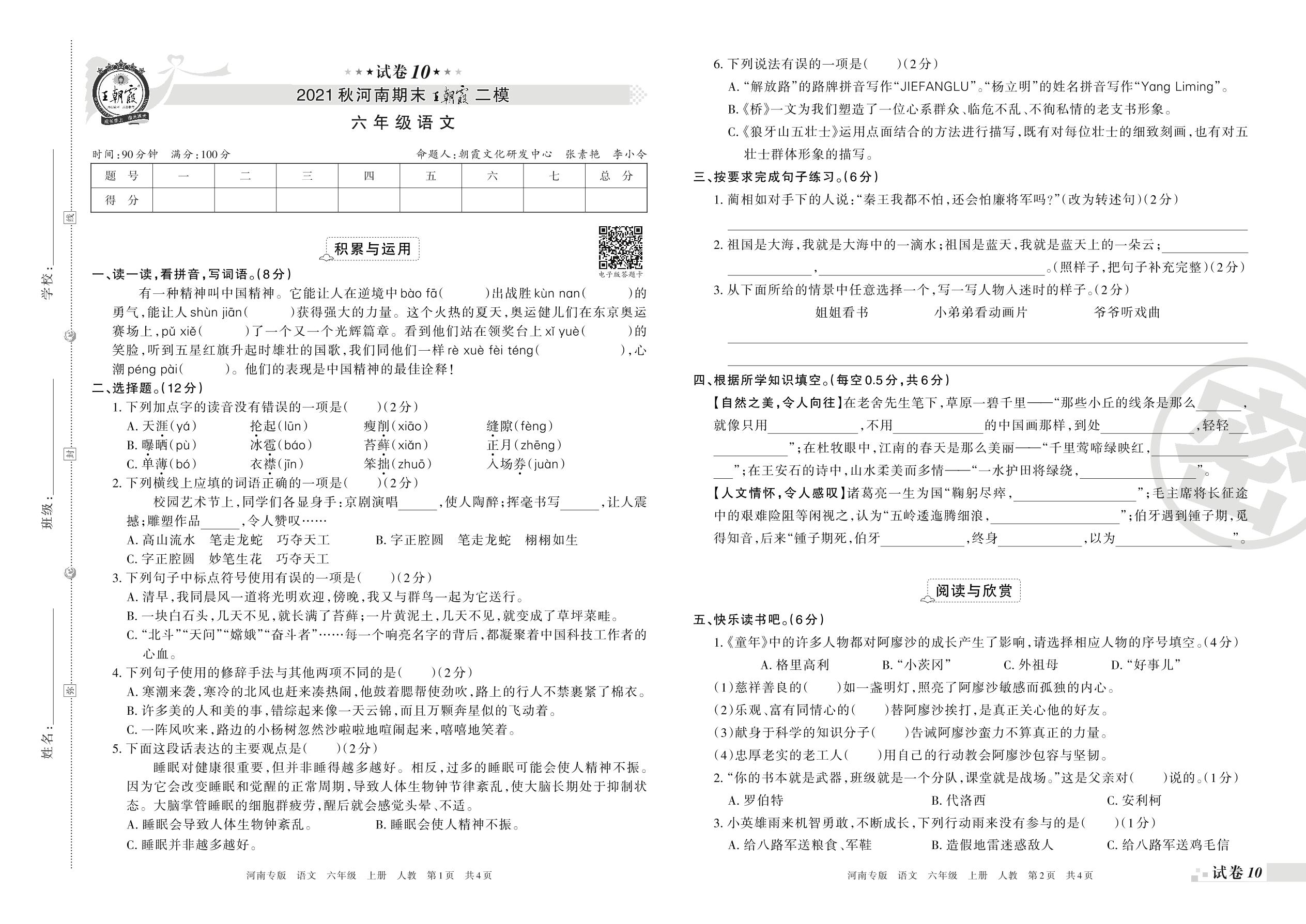 王朝霞期末模拟卷六年级上册语文(人教版)_R211225175212893【10】