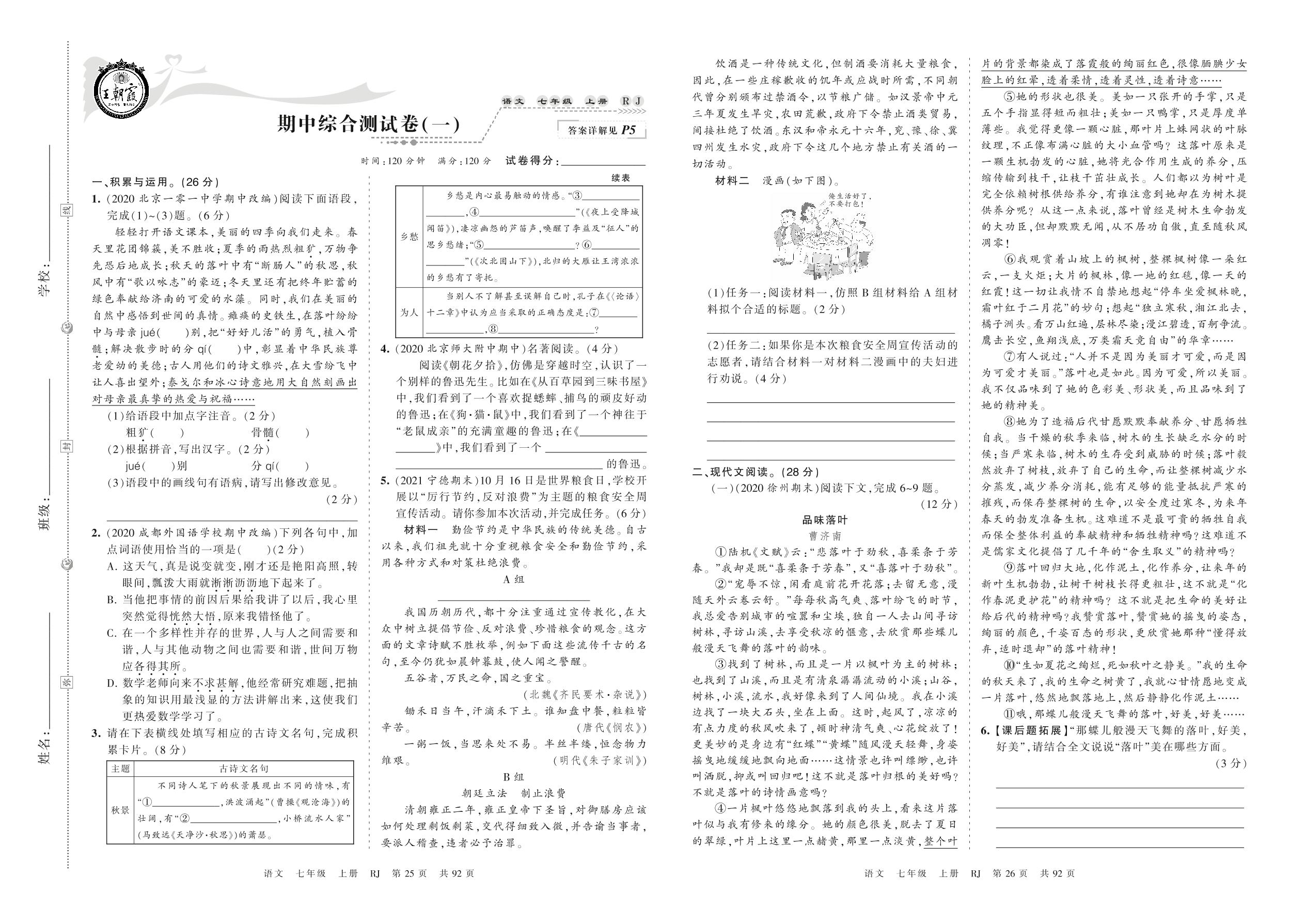 2021上册七年级语文人教版 期中综合测试卷(一)