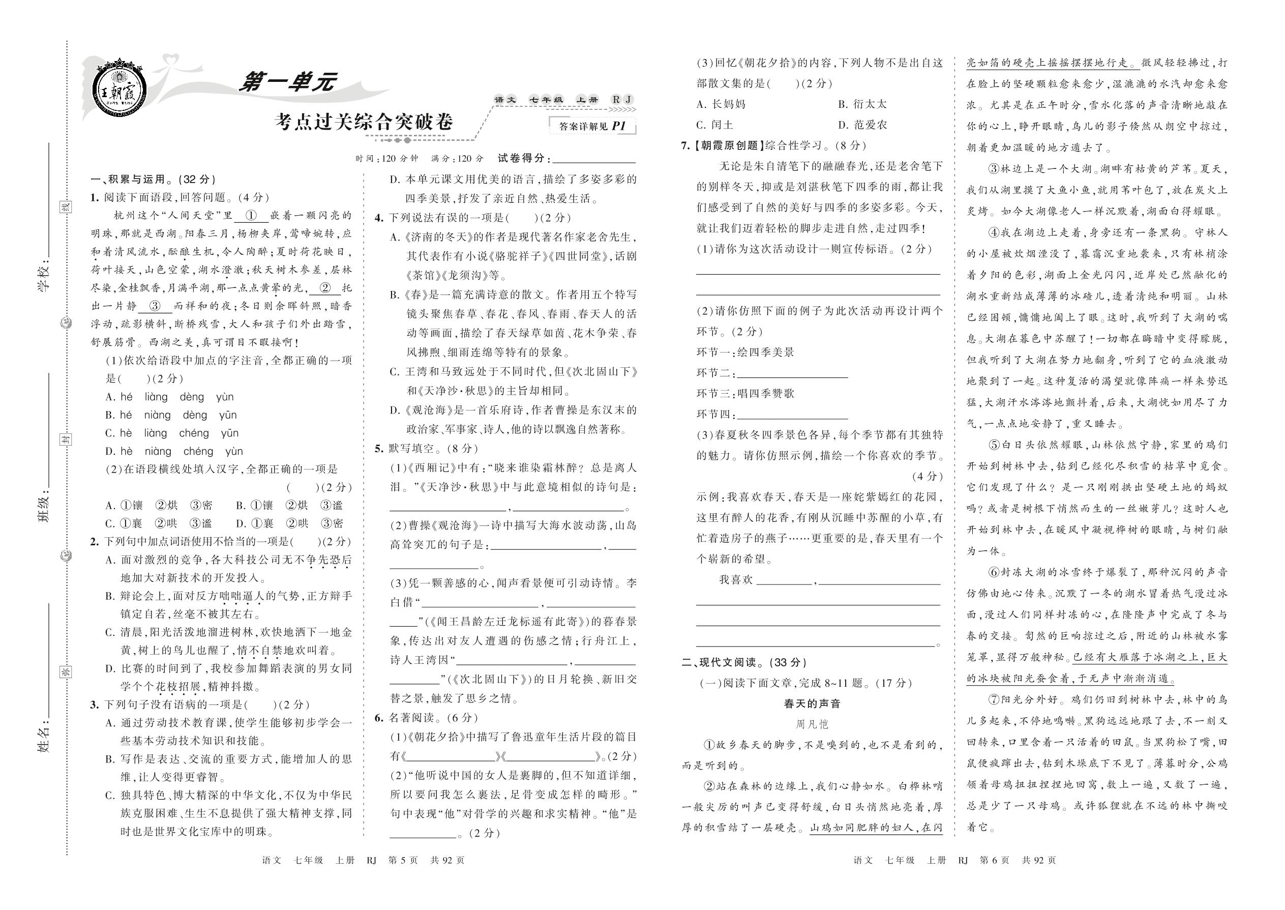 2021上册七年级语文人教版 第一单元 考点过关综合突破卷