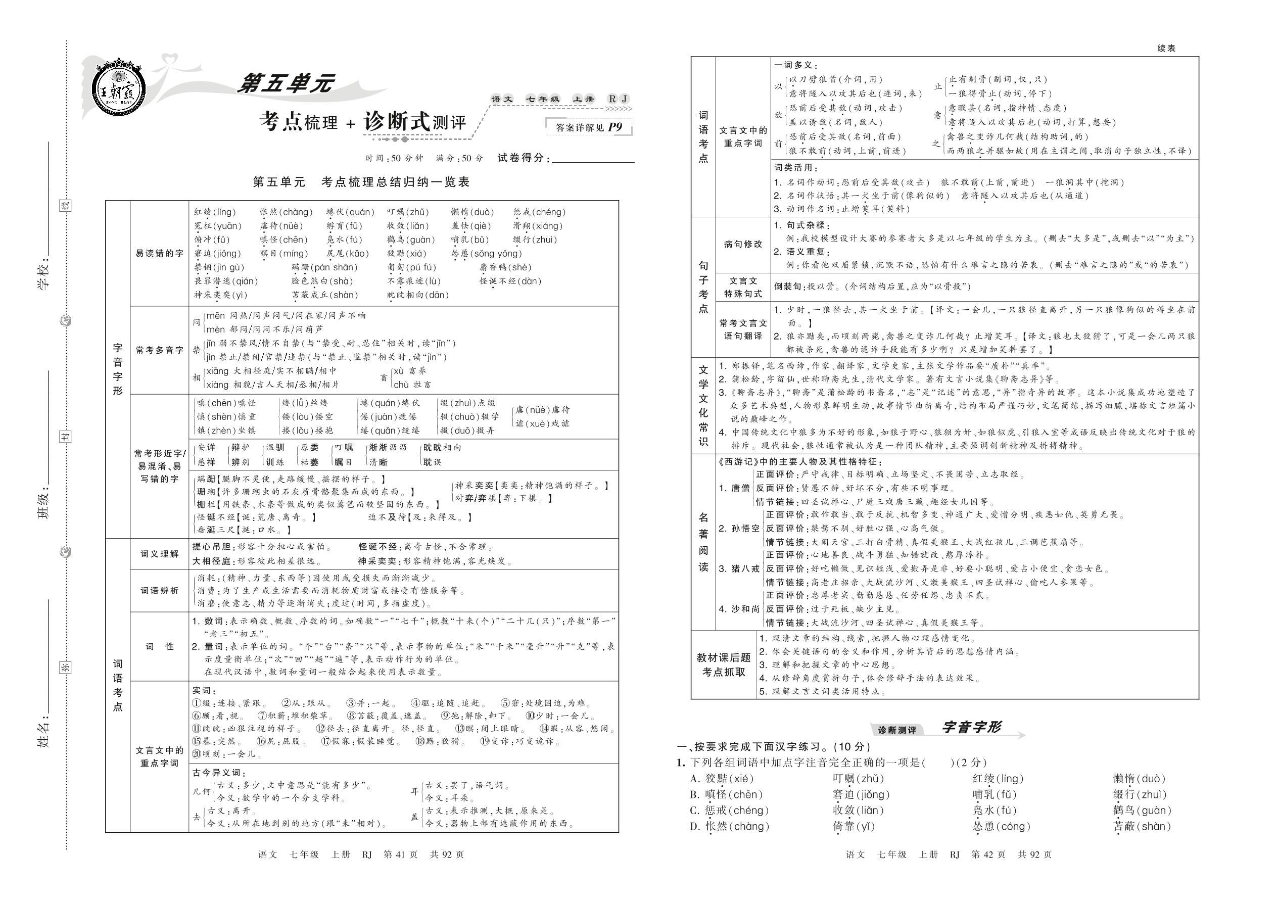 2021上册七年级语文人教版 第五单元 考点梳理+诊断式测评