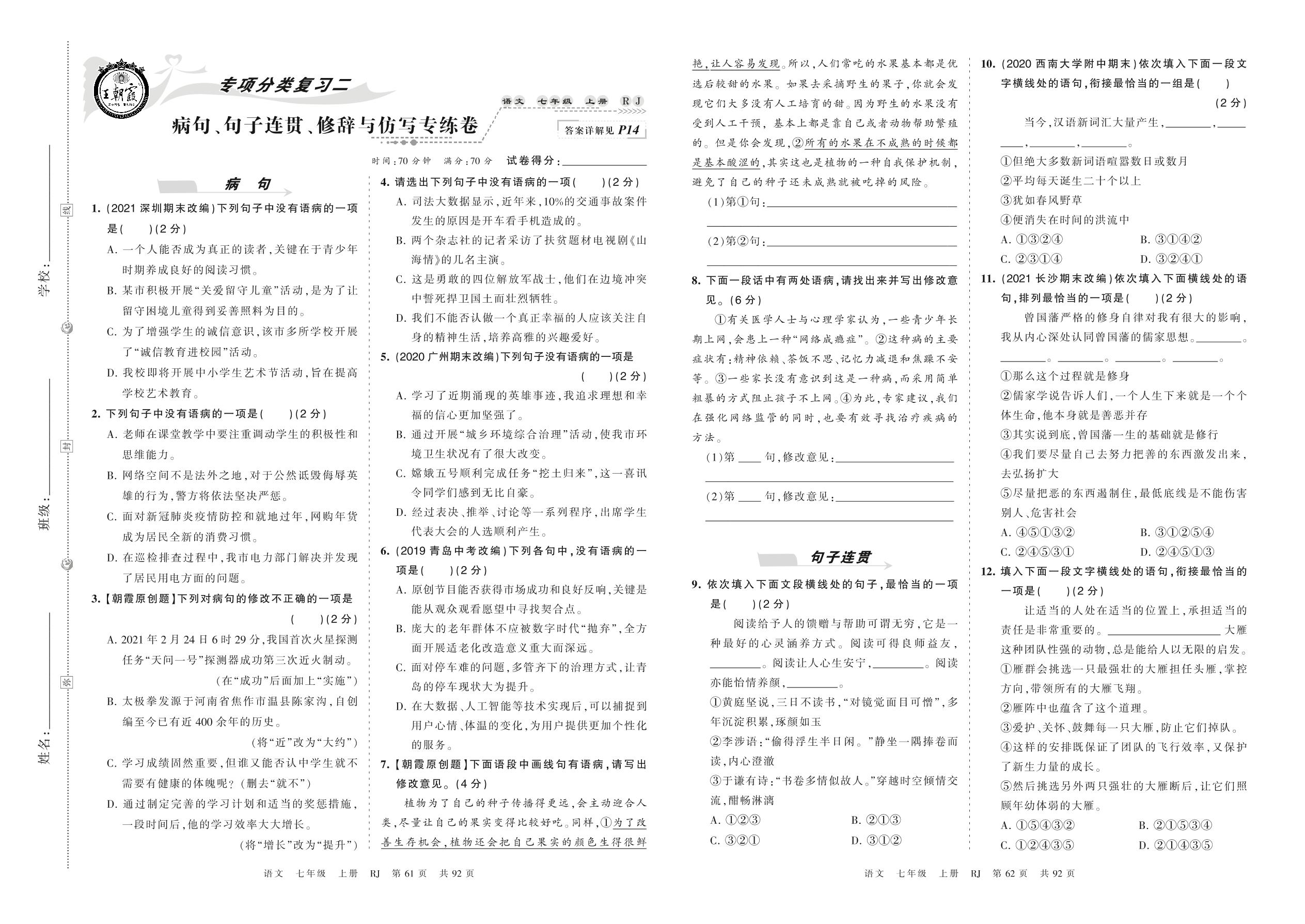 2021上册七年级语文人教版 病句、句子连贯、修辞与仿写专练卷