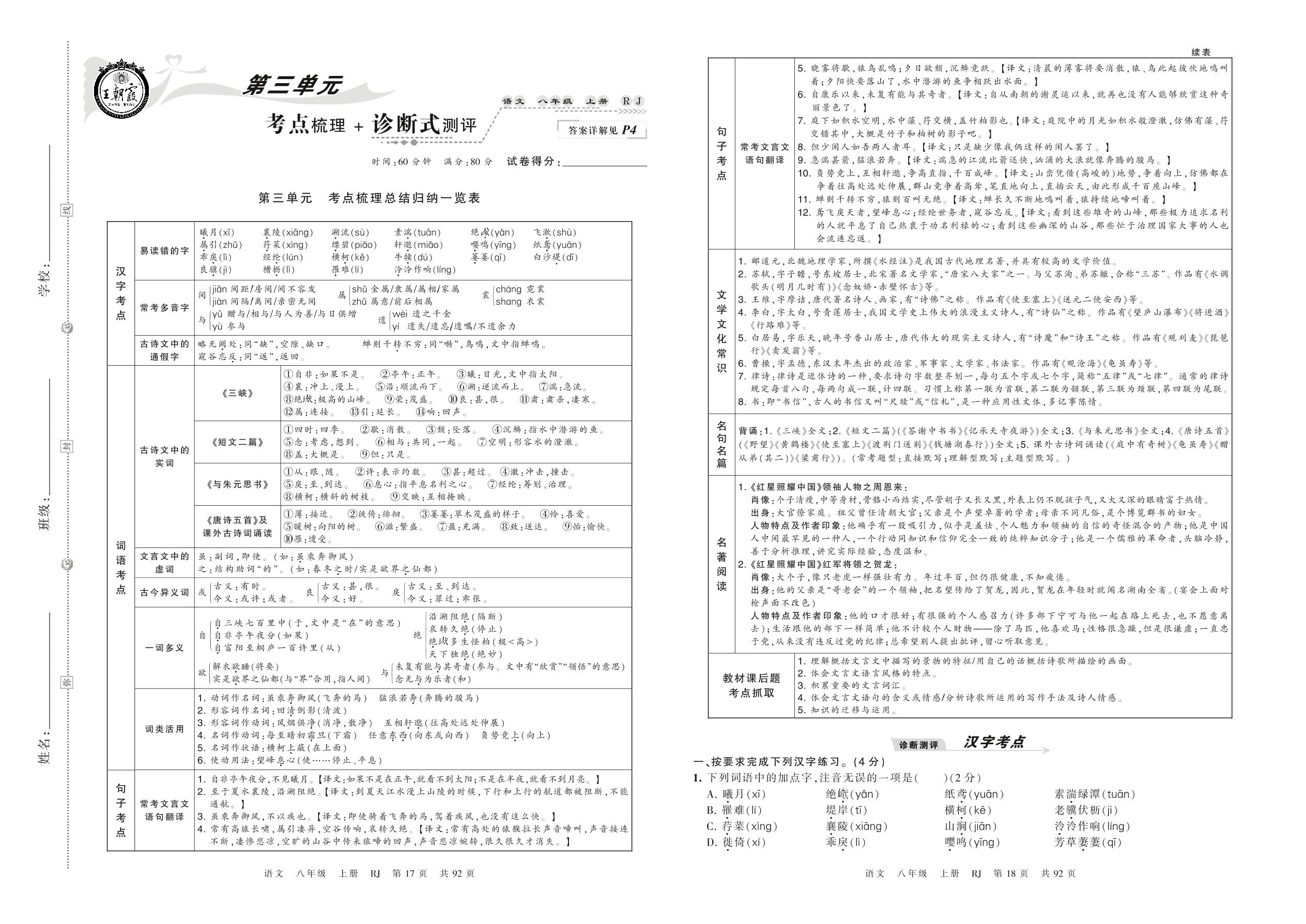 2021上册八年级语文人教版 第三单元 考点梳理+诊断式测评