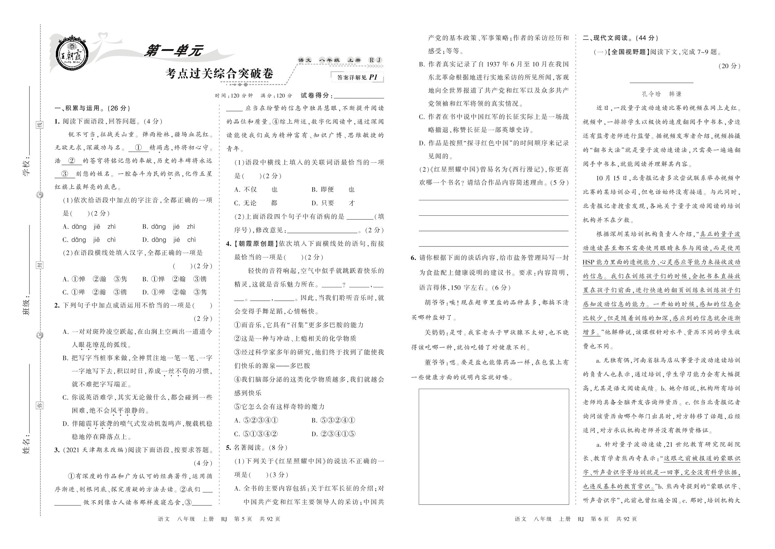 2021上册八年级语文人教版 第一单元 考点过关综合突破卷