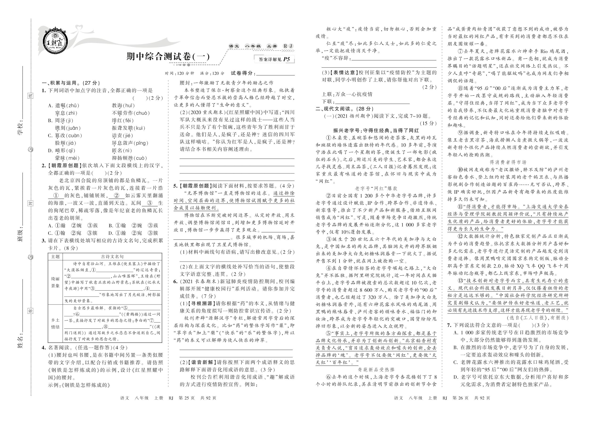 2021上册八年级语文人教版 期中综合测试卷(一)