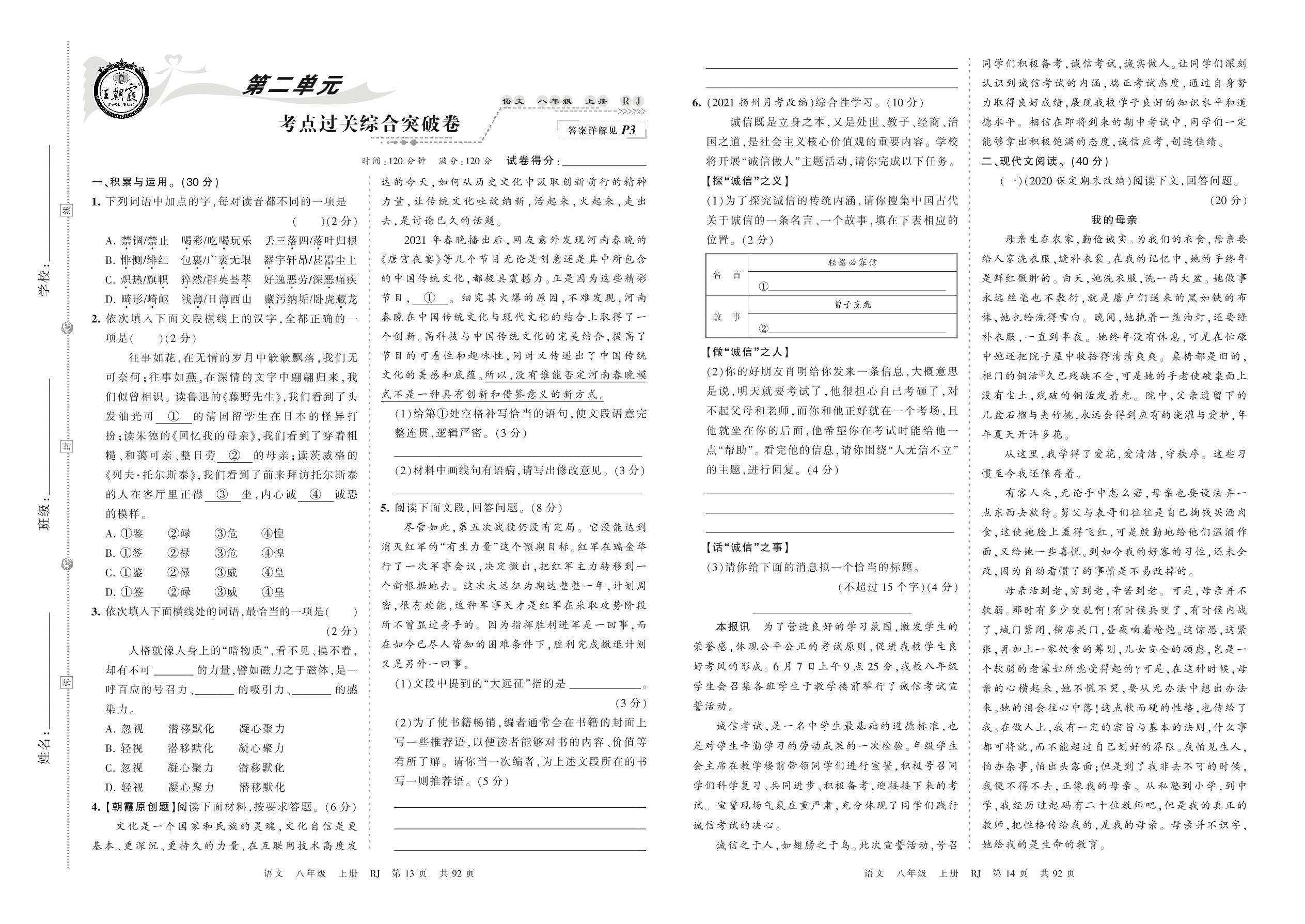2021上册八年级语文人教版 第二单元 考点过关综合突破卷