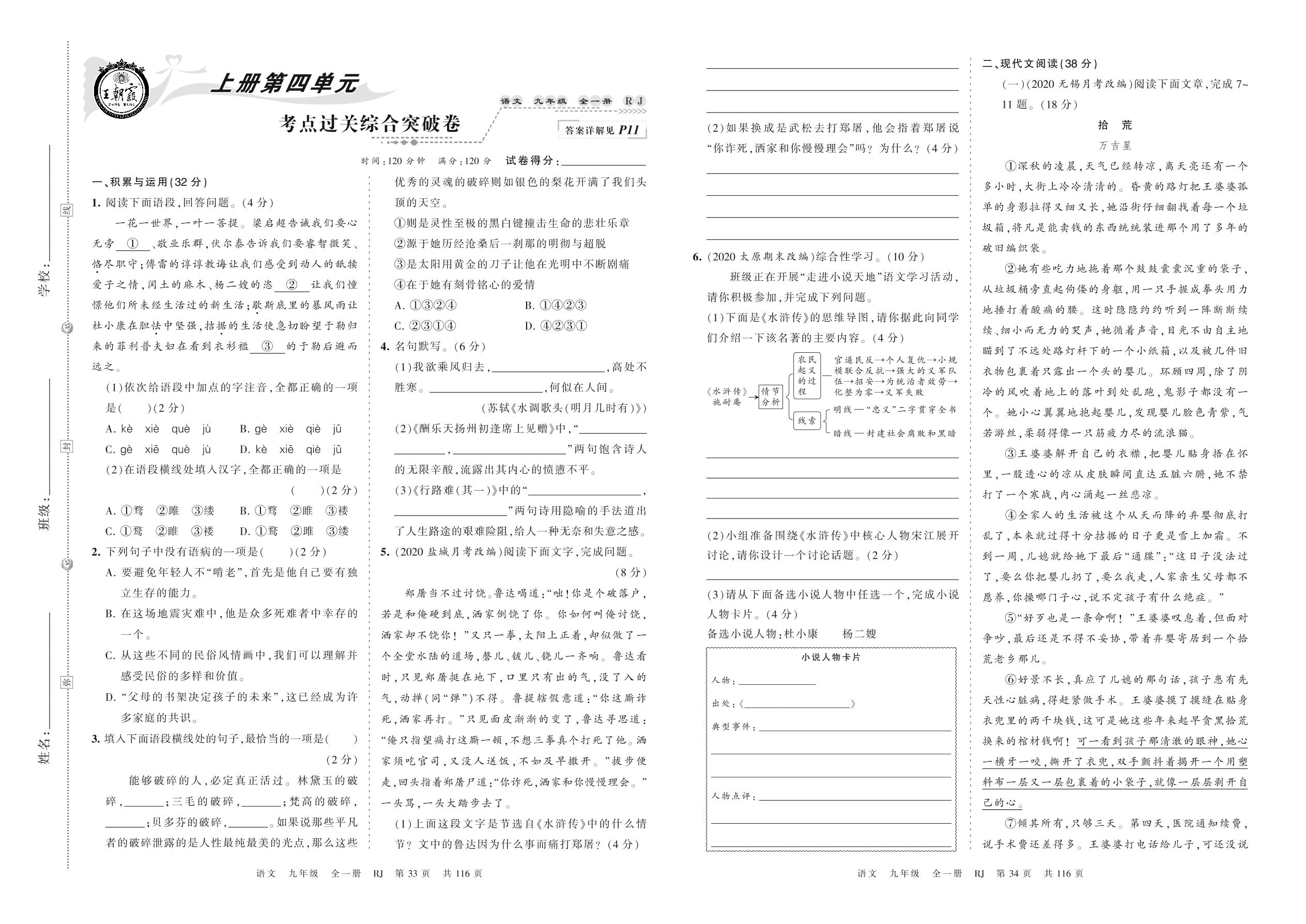 2021秋上册九年级语文人教版 第四单元 考点过关综合突破卷