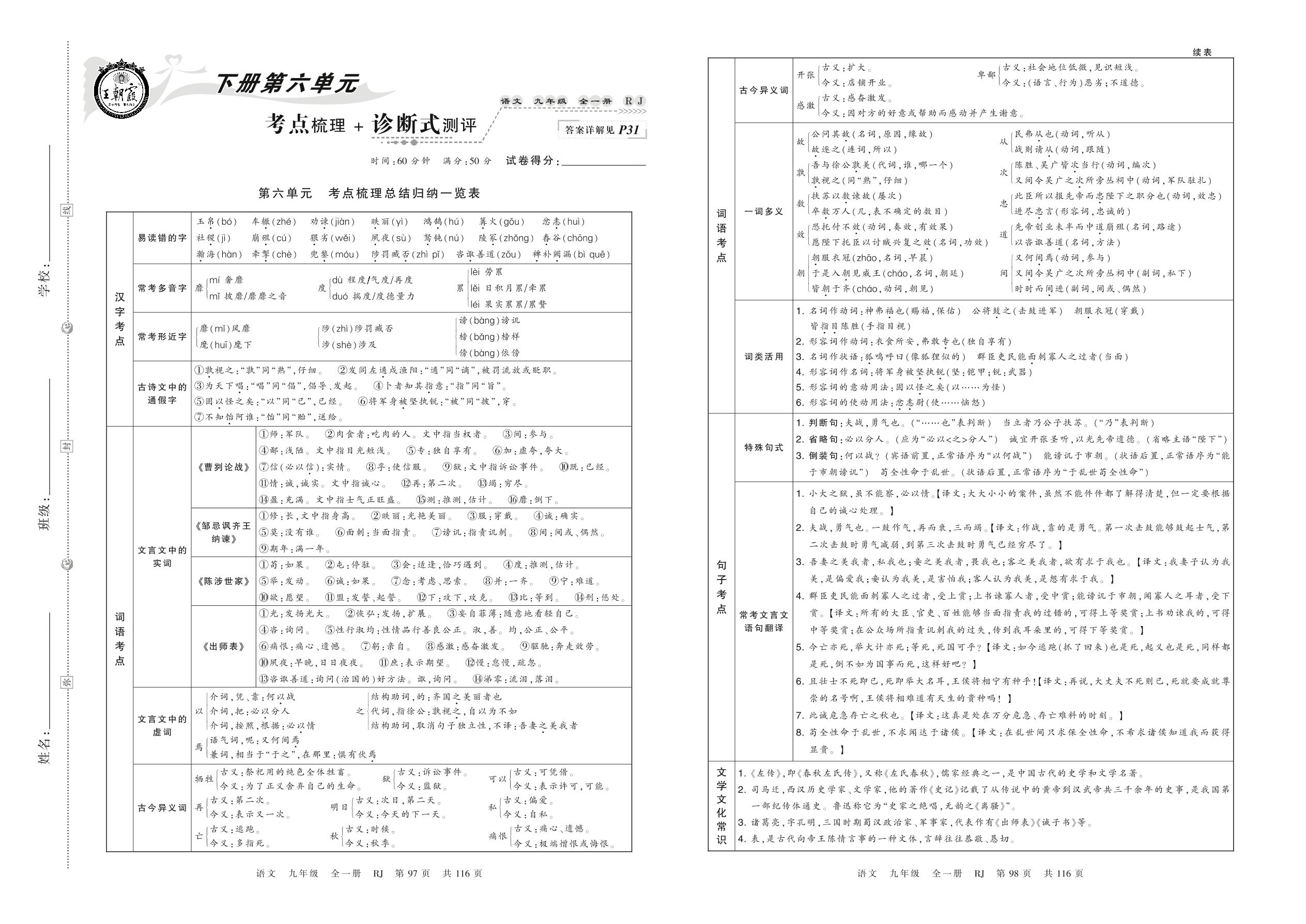 2022春下册九年级语文人教版 第六单元 考点梳理+诊断式测评