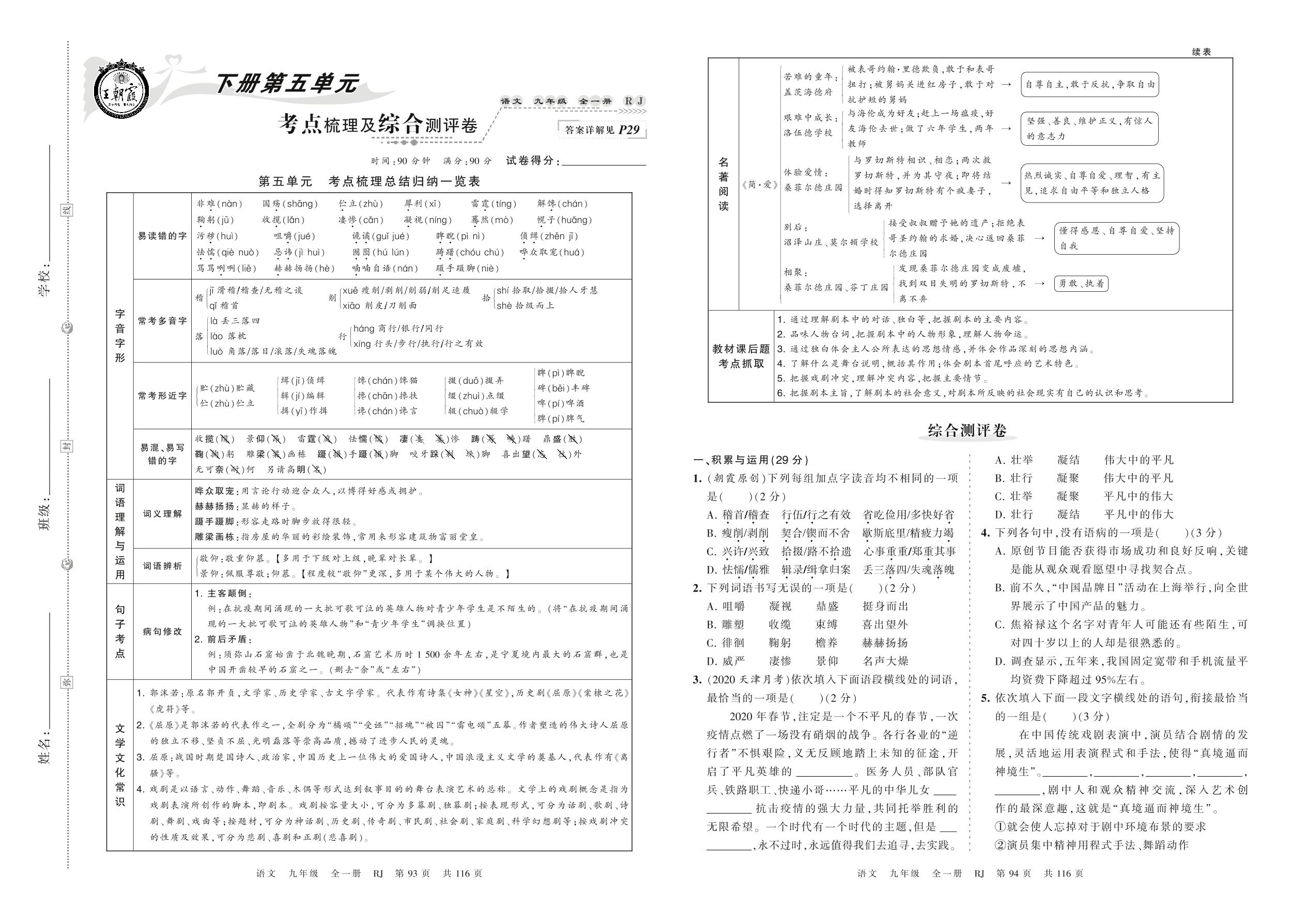 2022春下册九年级语文人教版 第五单元 考点梳理及综合测评卷