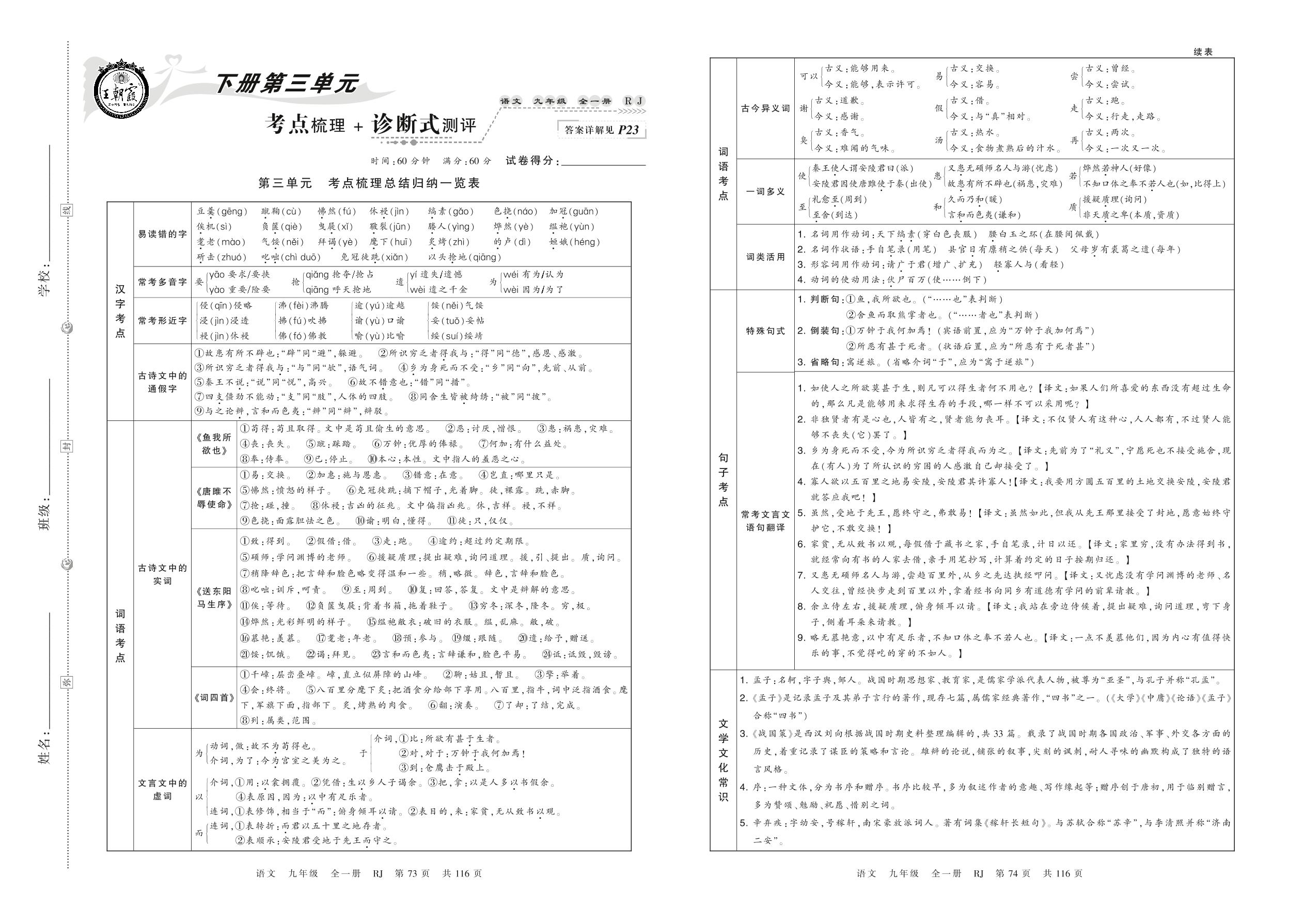 2022春下册九年级语文人教版 第三单元 考点梳理+诊断式测评