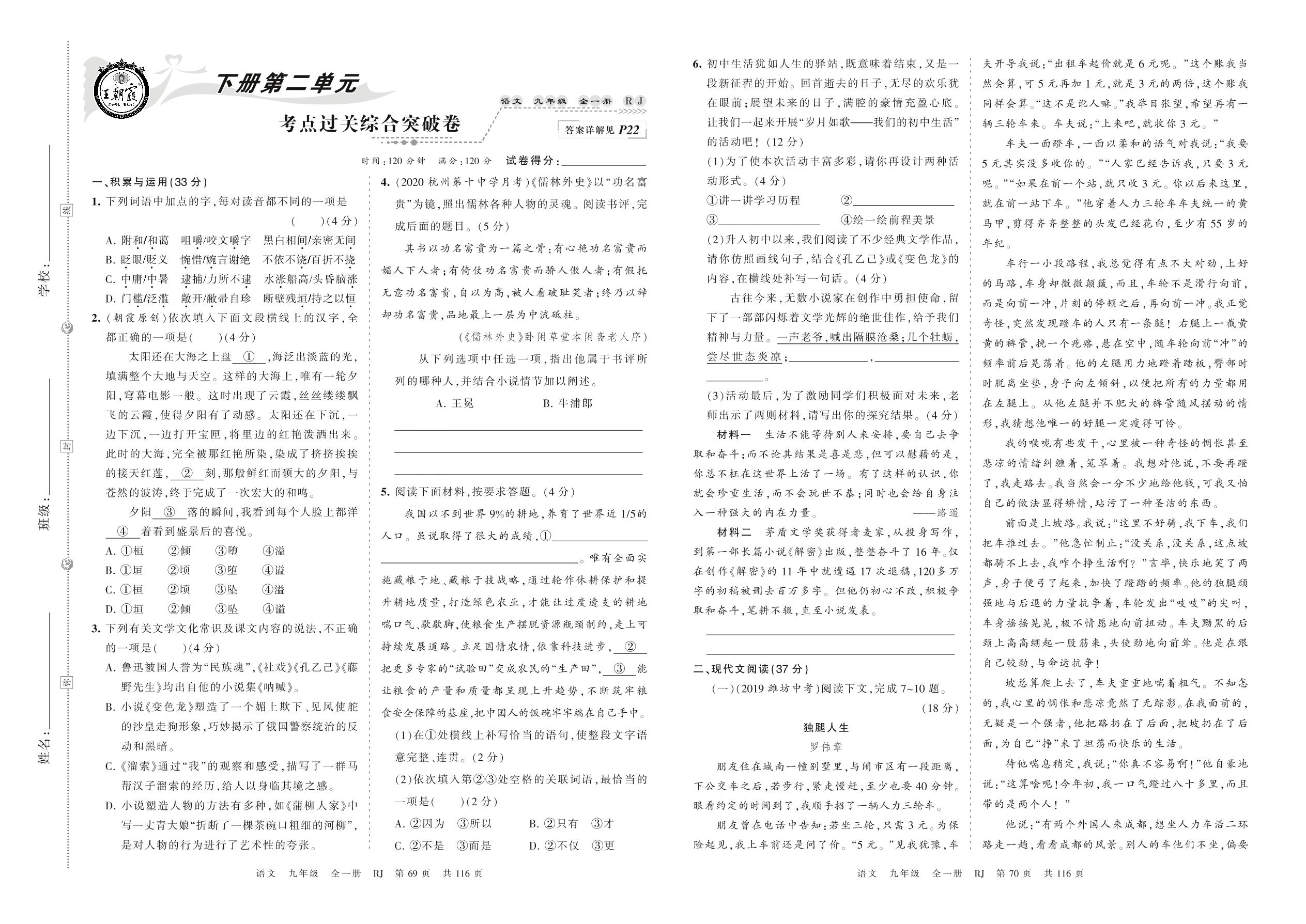 2022春下册九年级语文人教版 第二单元 考点过关综合突破卷