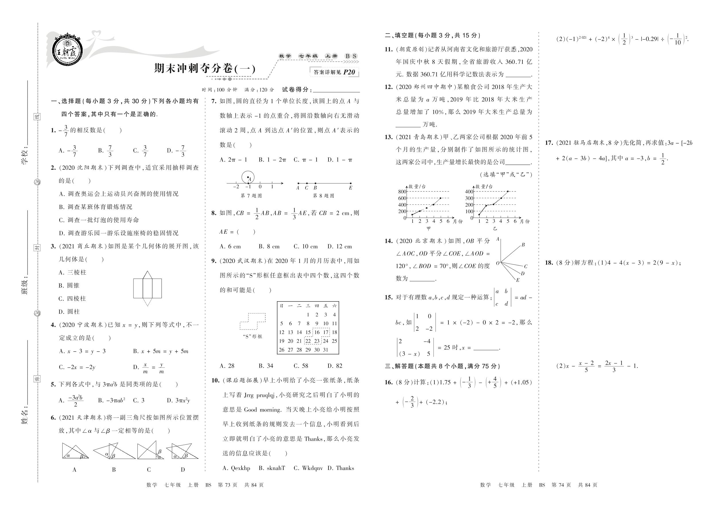 2021上册七年级数学北师版 期末冲刺夺分卷(一)