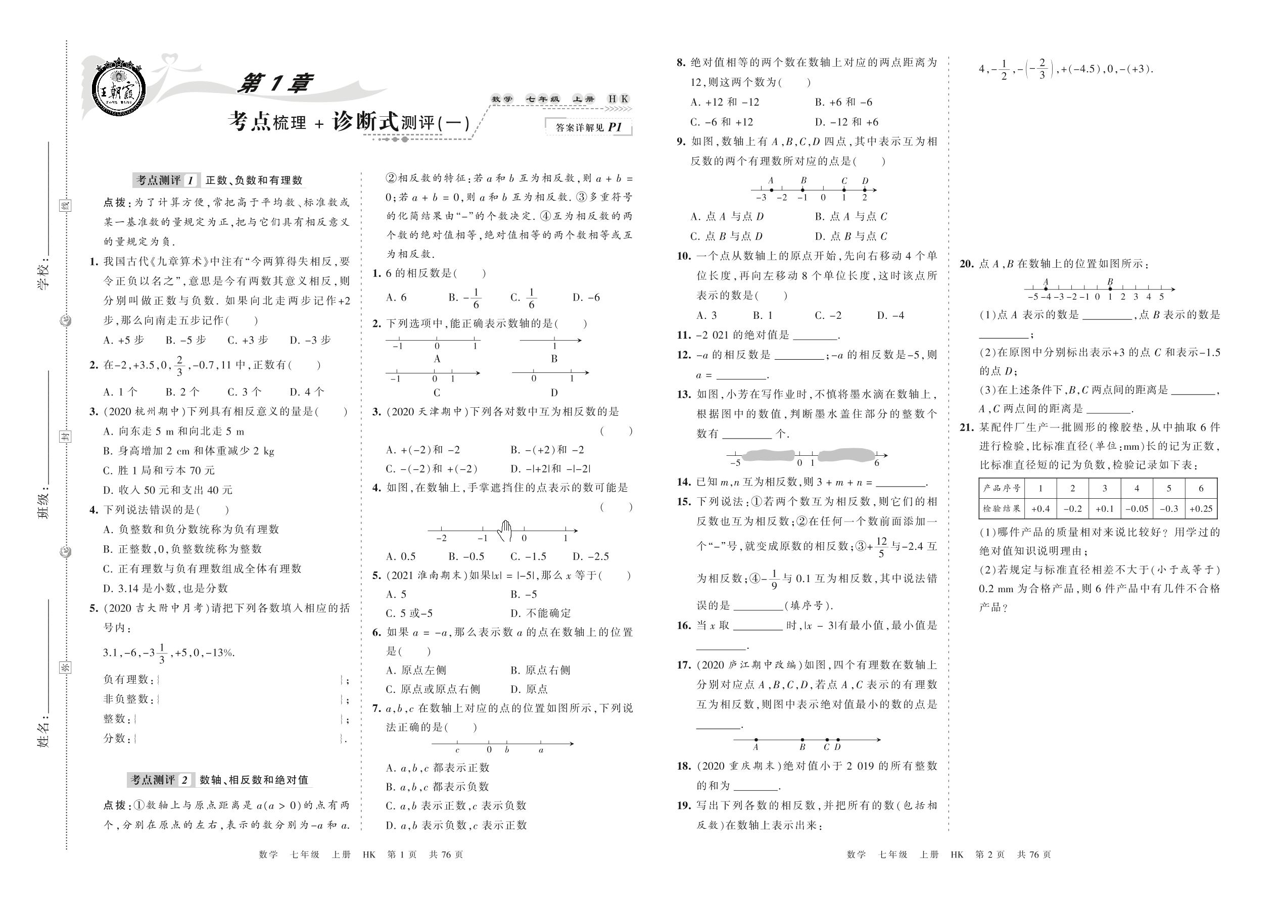 2021上册七年级数学沪科版 第1章 考点梳理+诊断式测评(一)