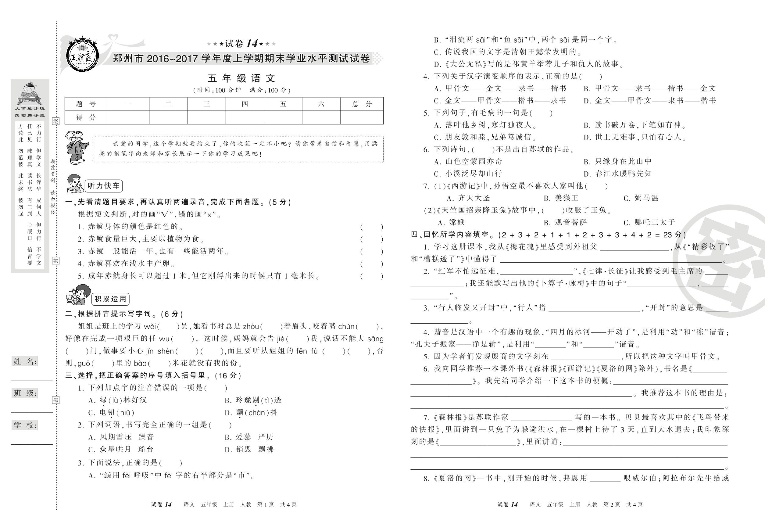 2016-2017学年第一学期郑州市五年级语文试卷(人教版)【14】