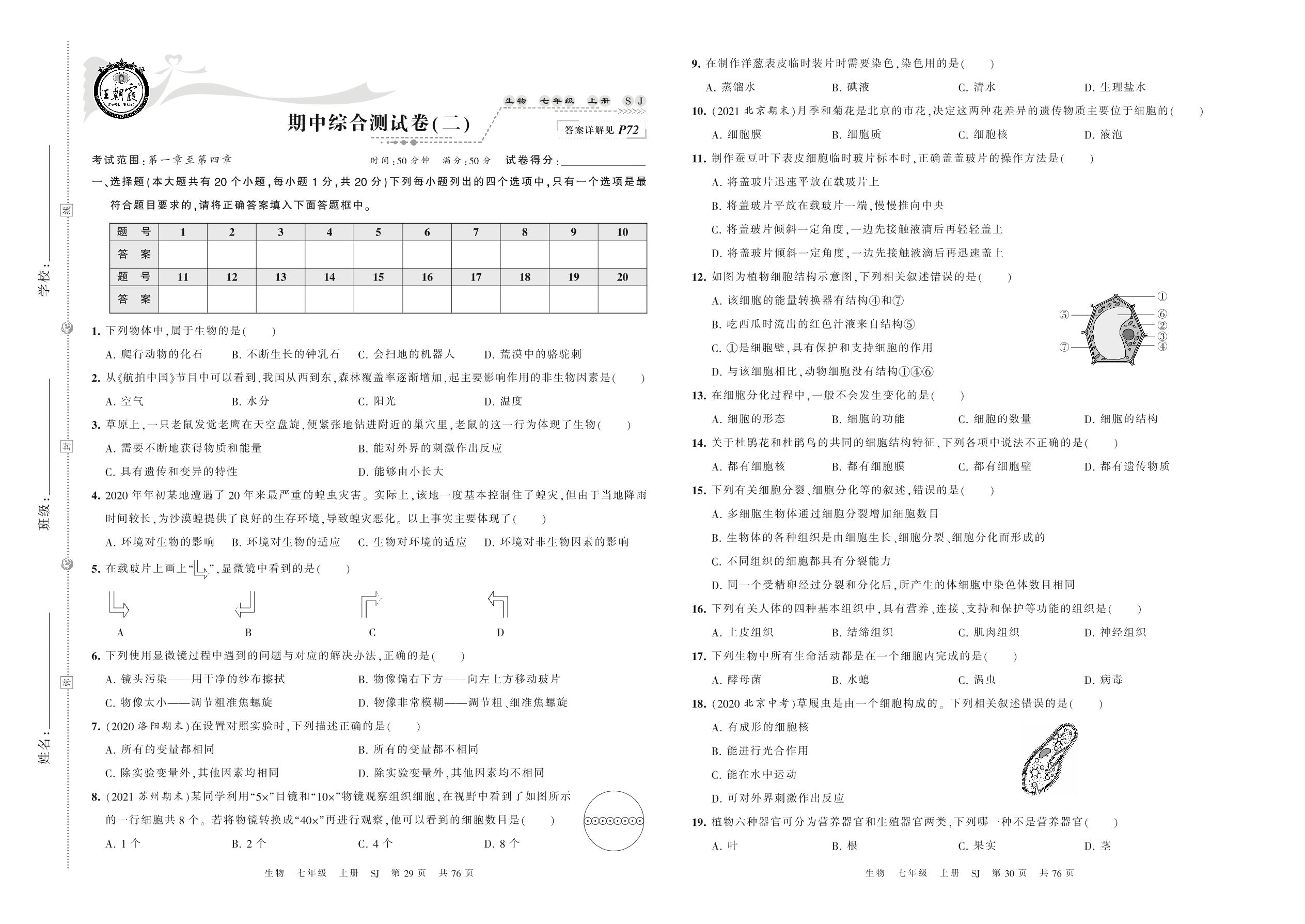 2021上册七年级生物苏教版 期中综合测试卷(二)