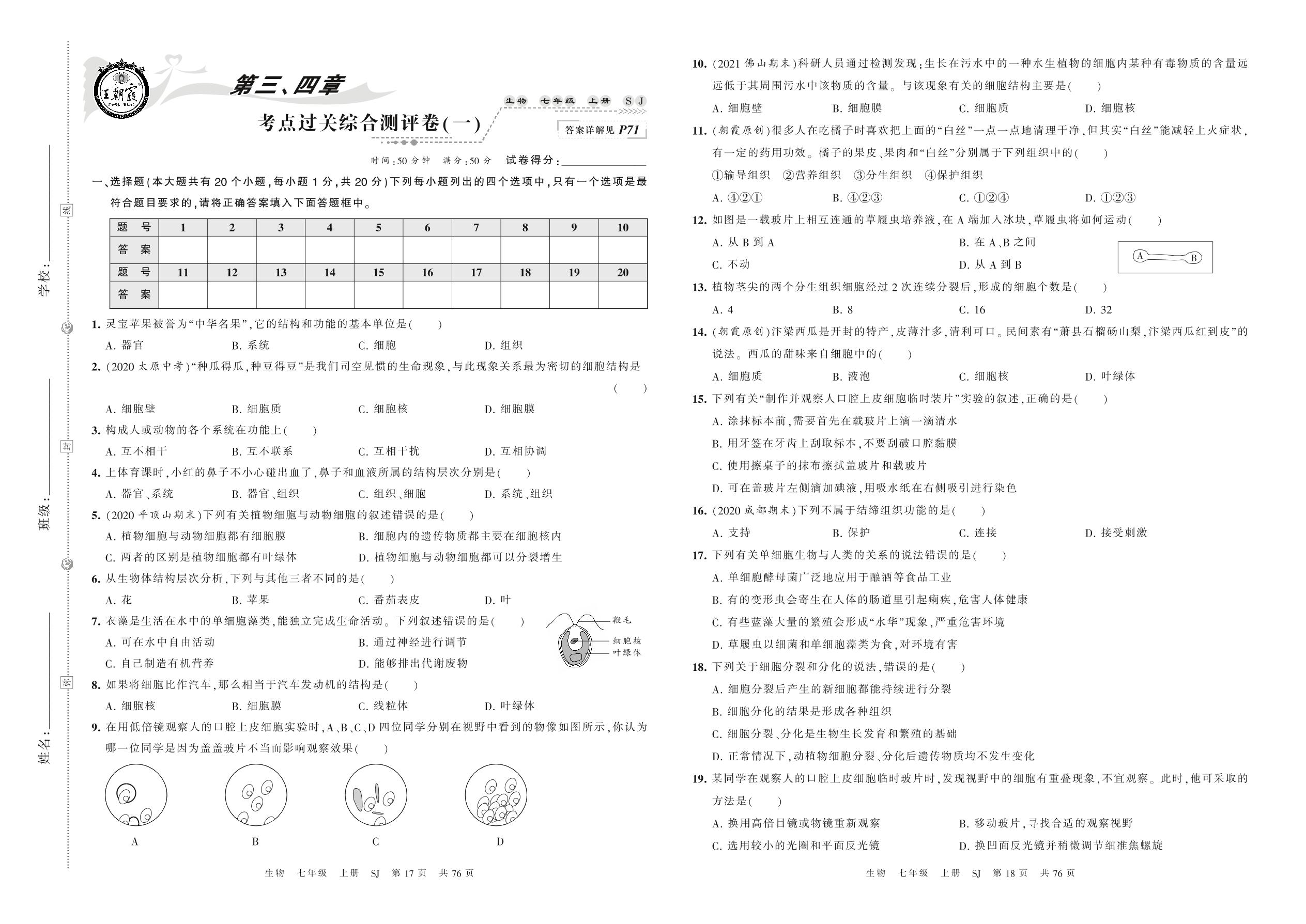 2021上册七年级生物苏教版 第三、四章 考点过关综合测评卷(一)