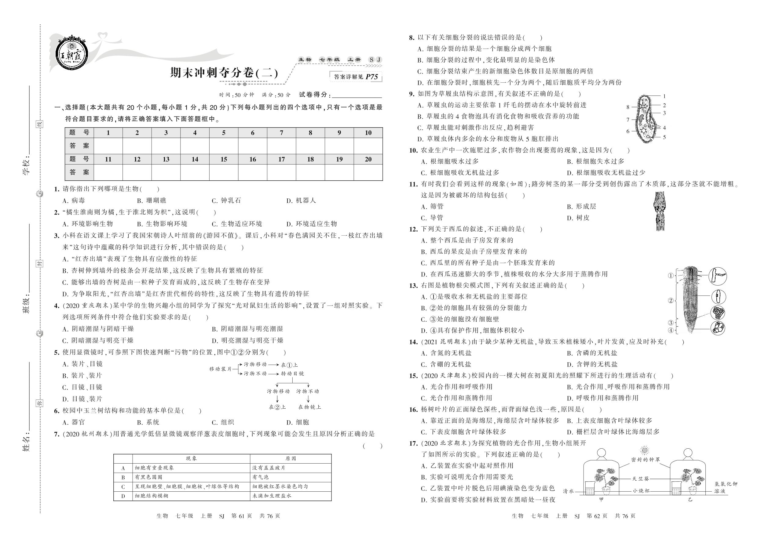2021上册七年级生物苏教版 期末冲刺夺分卷(二)