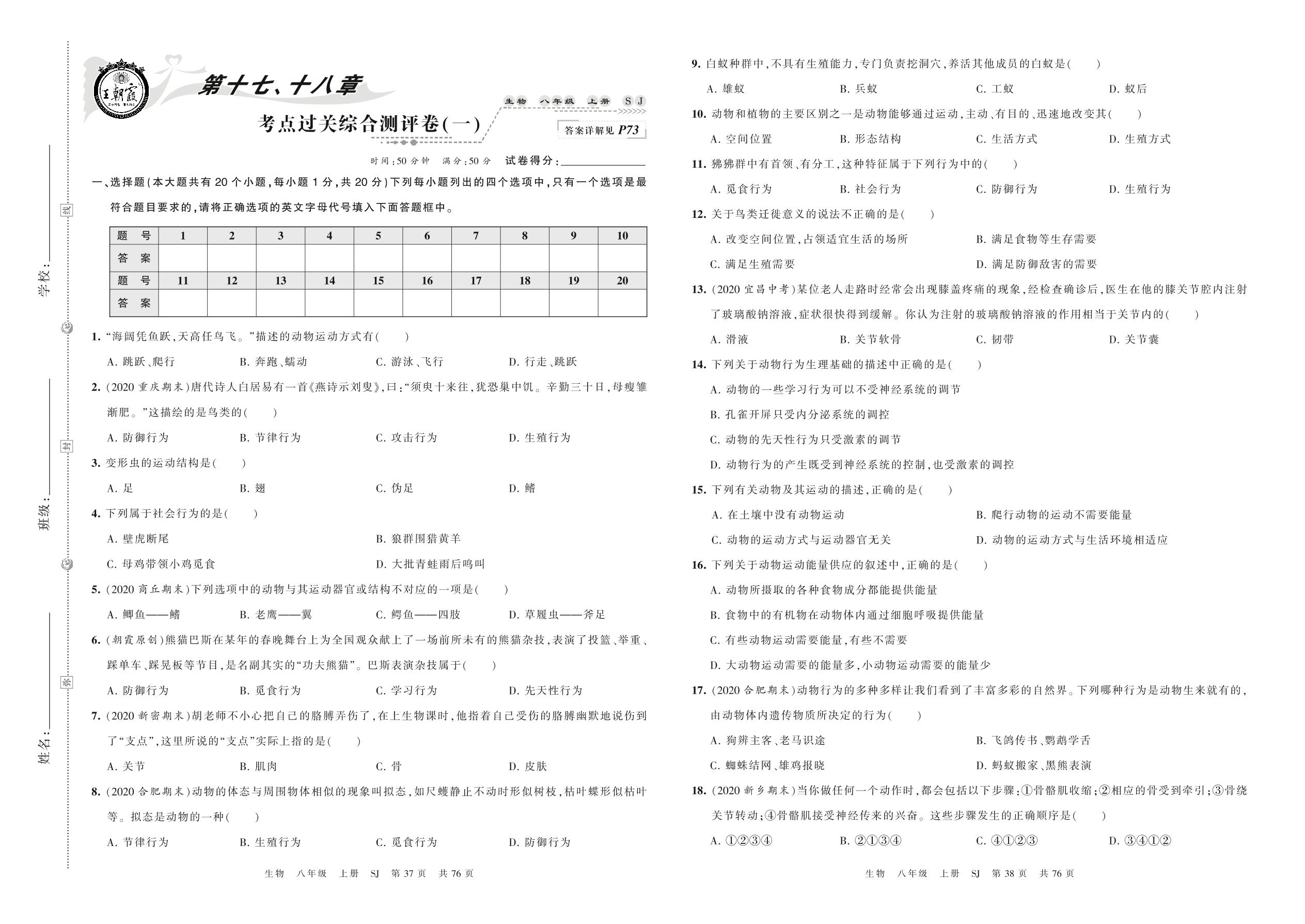 2021上册八年级生物苏教版 第十七、十八章 考点过关综合测评卷(一)