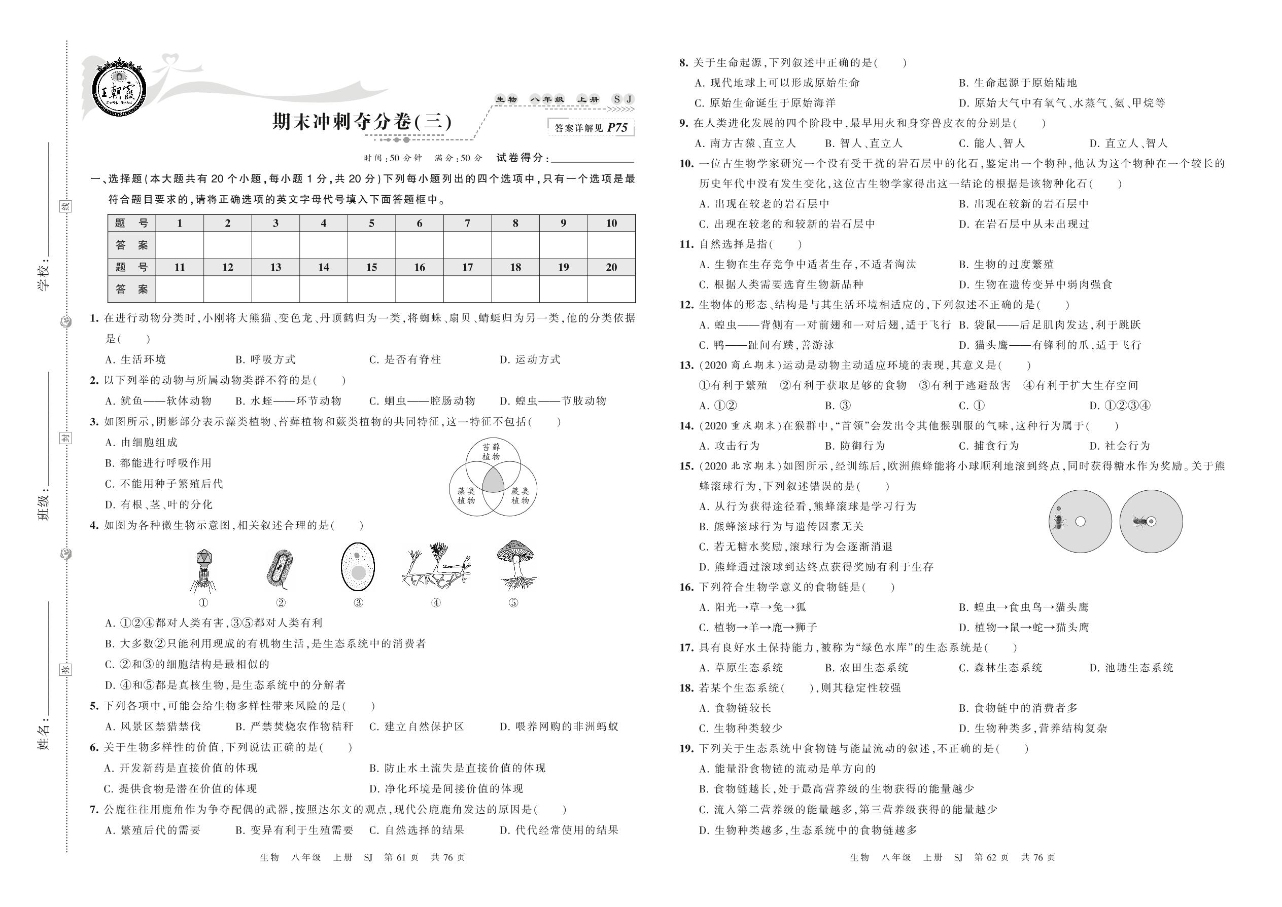 2021上册八年级生物苏教版 期末冲刺夺分卷(三)