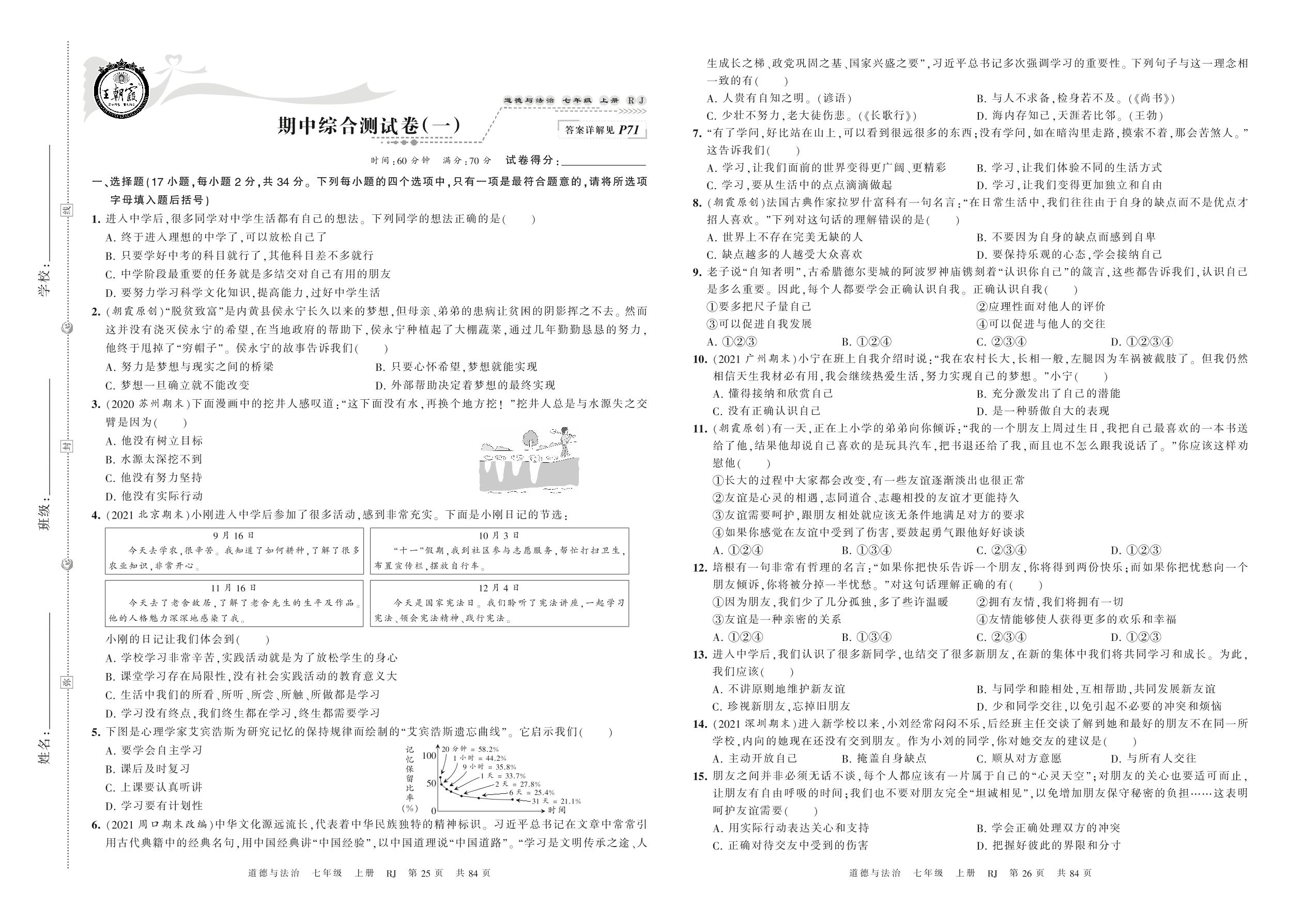 2021上册七年级道德与法治人教版 期中综合测试卷(一)