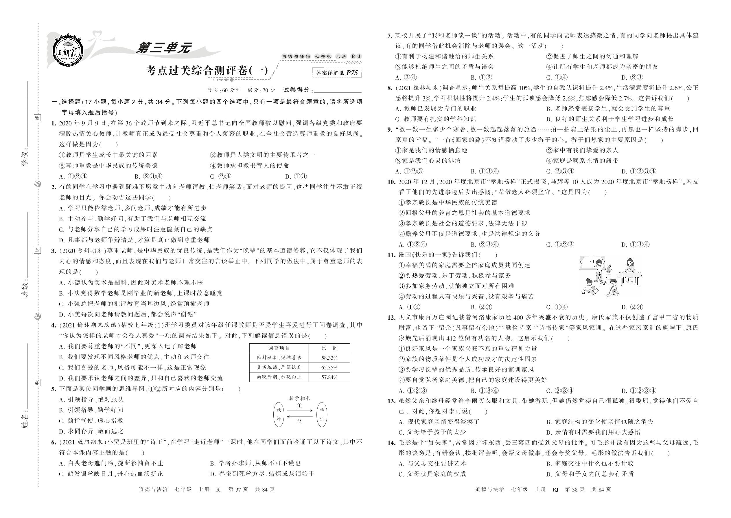 2021上册七年级道德与法治人教版 第三单元 考点过关综合测评卷(一)