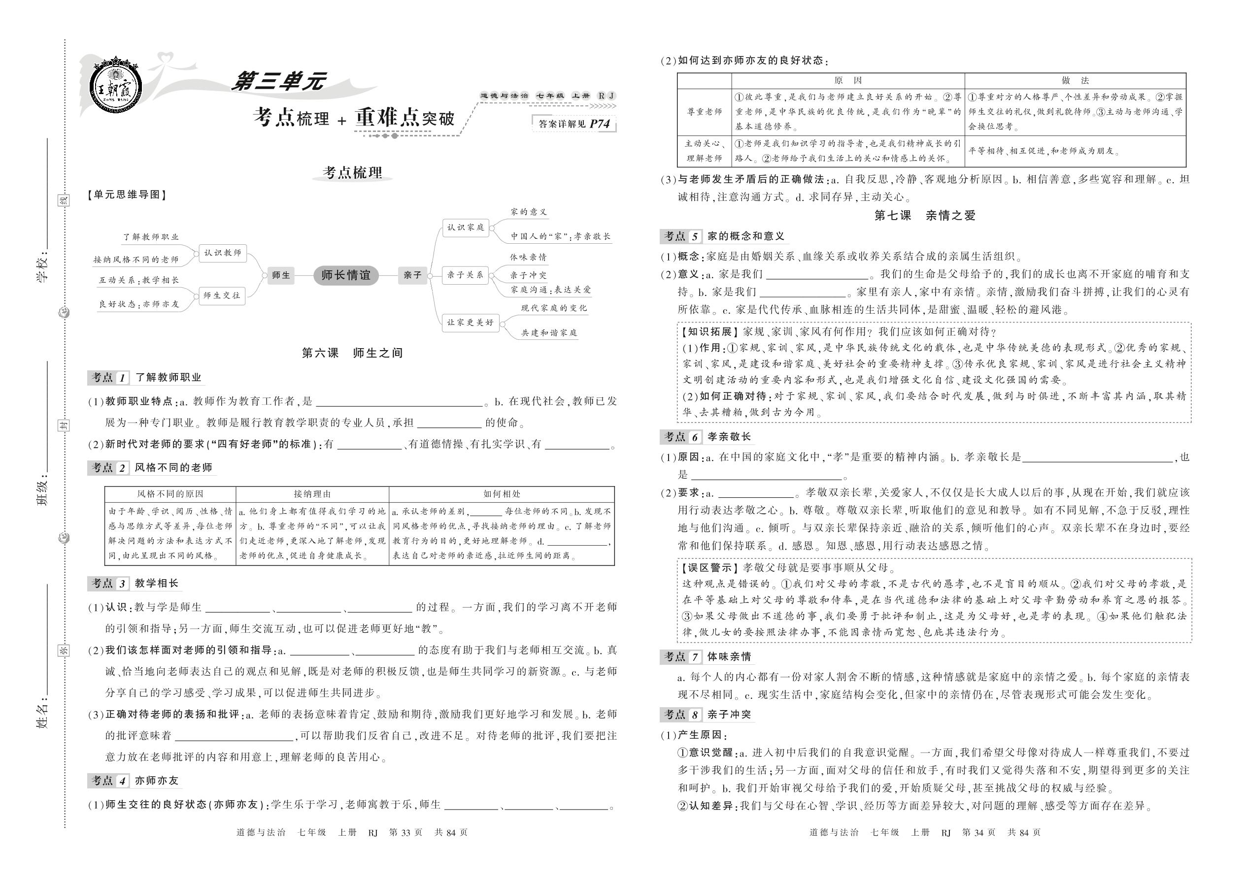 2021上册七年级道德与法治人教版 第三单元 考点梳理+重难点突破