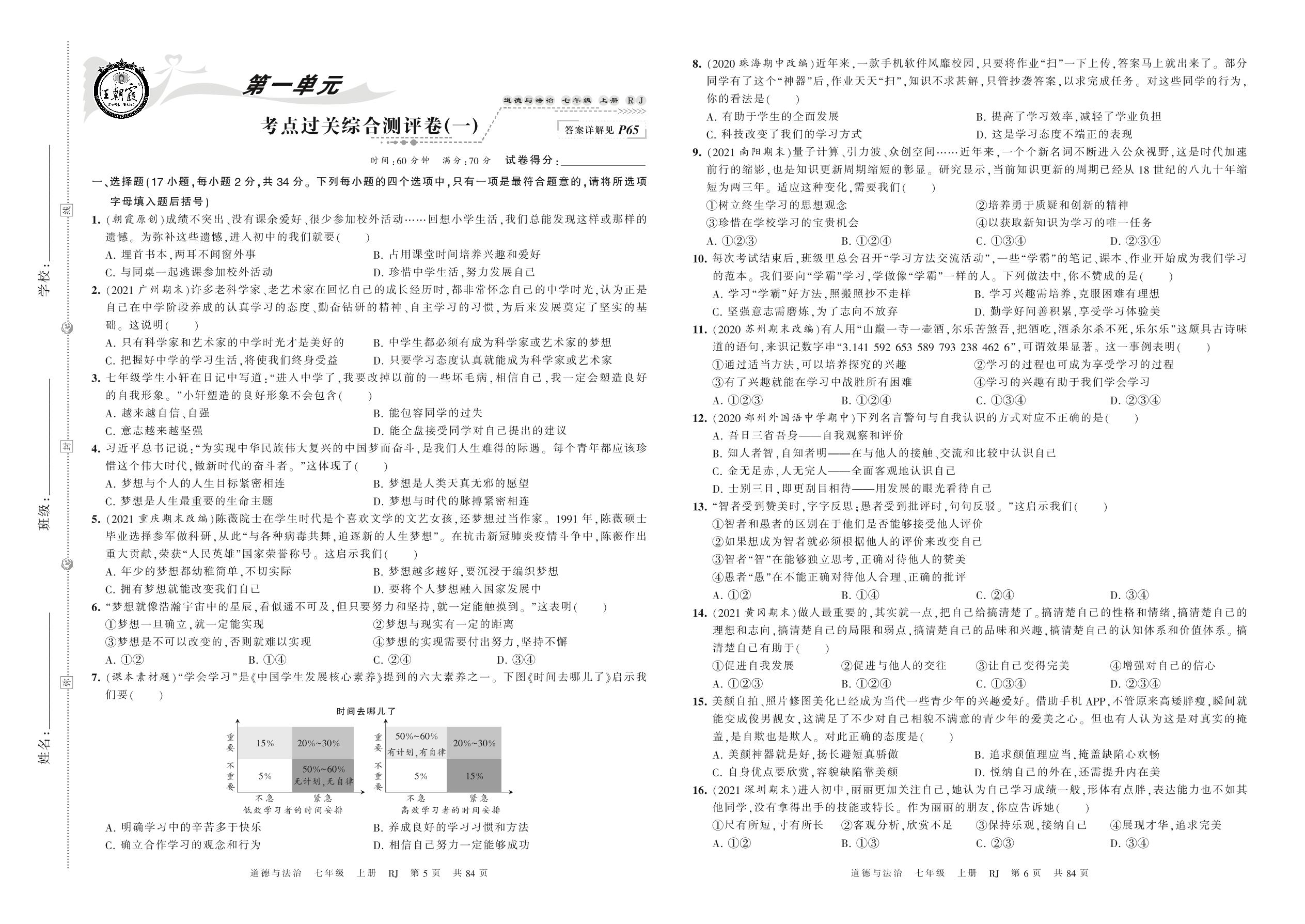 2021上册七年级道德与法治人教版 第一单元 考点过关综合测评卷(一)