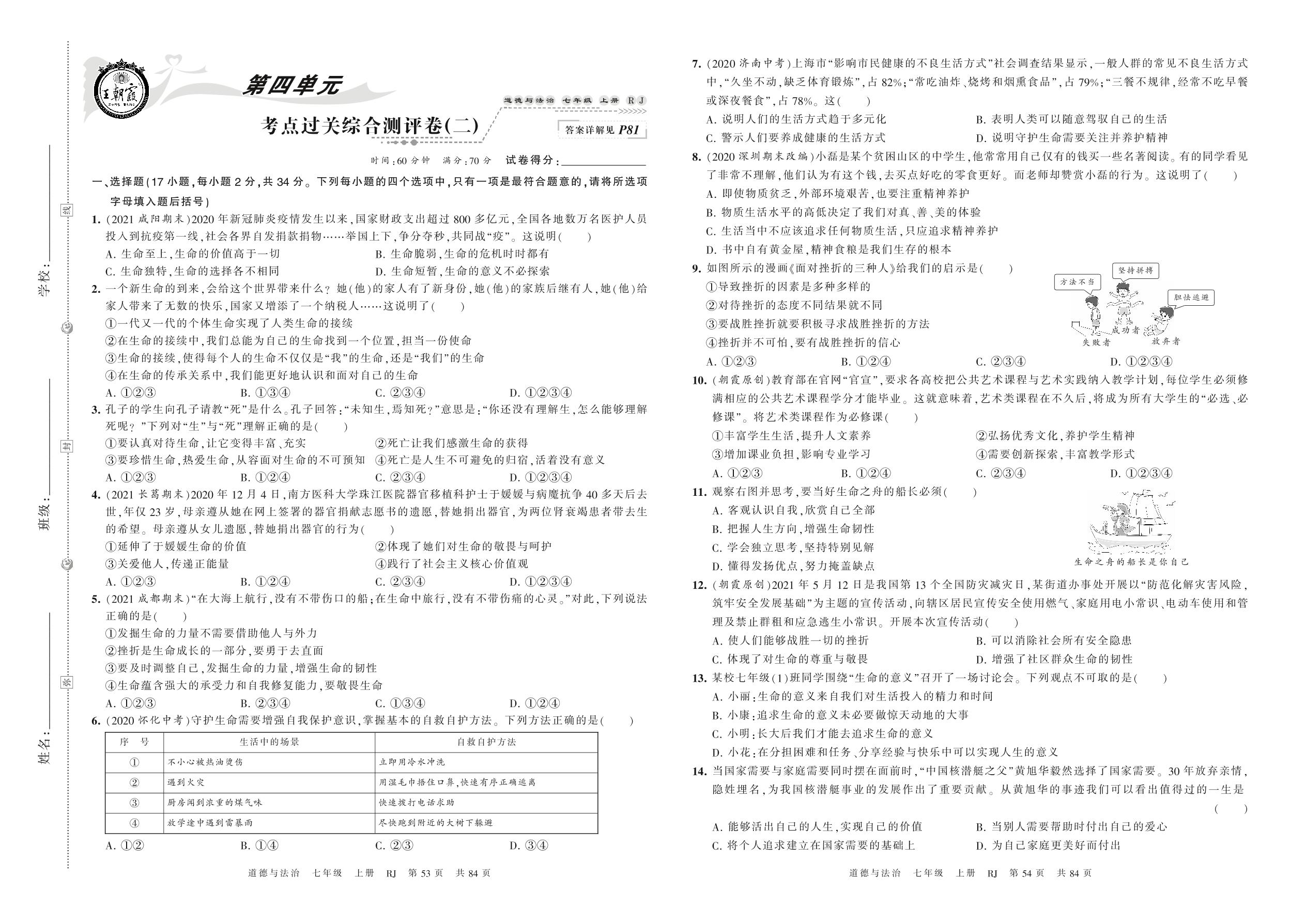 2021上册七年级道德与法治人教版 第四单元 考点过关综合测评卷(二)