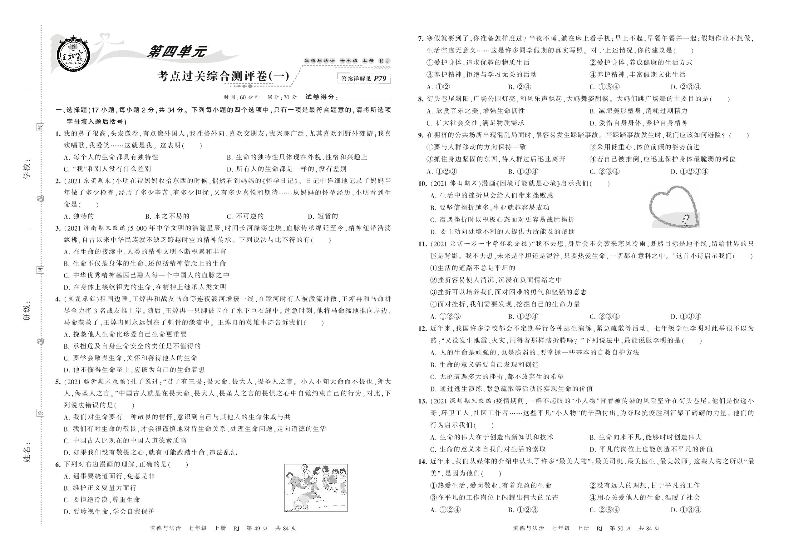 2021上册七年级道德与法治人教版 第四单元 考点过关综合测评卷(一)