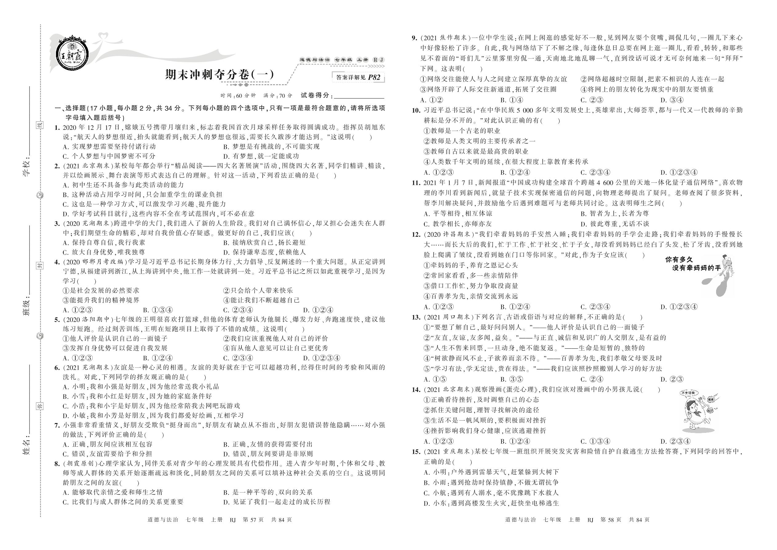 2021上册七年级道德与法治人教版 期末冲刺夺分卷(一)