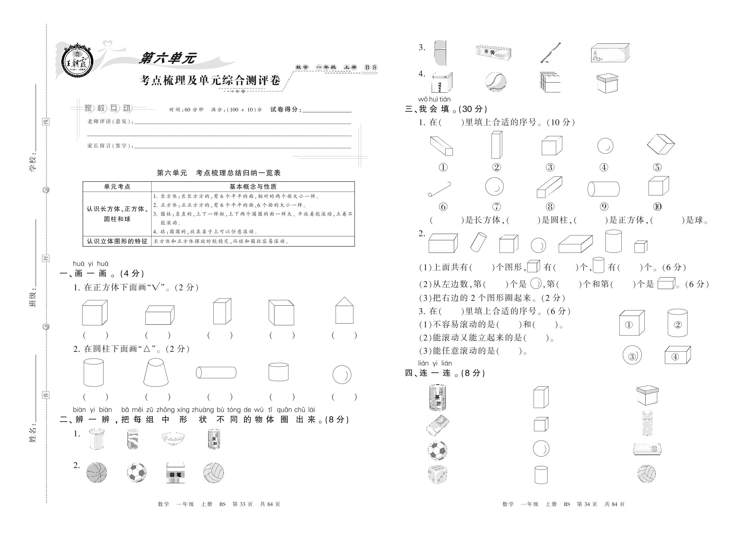 2021上册一年级数学北师版 第六单元 考点梳理及单元综合测评卷