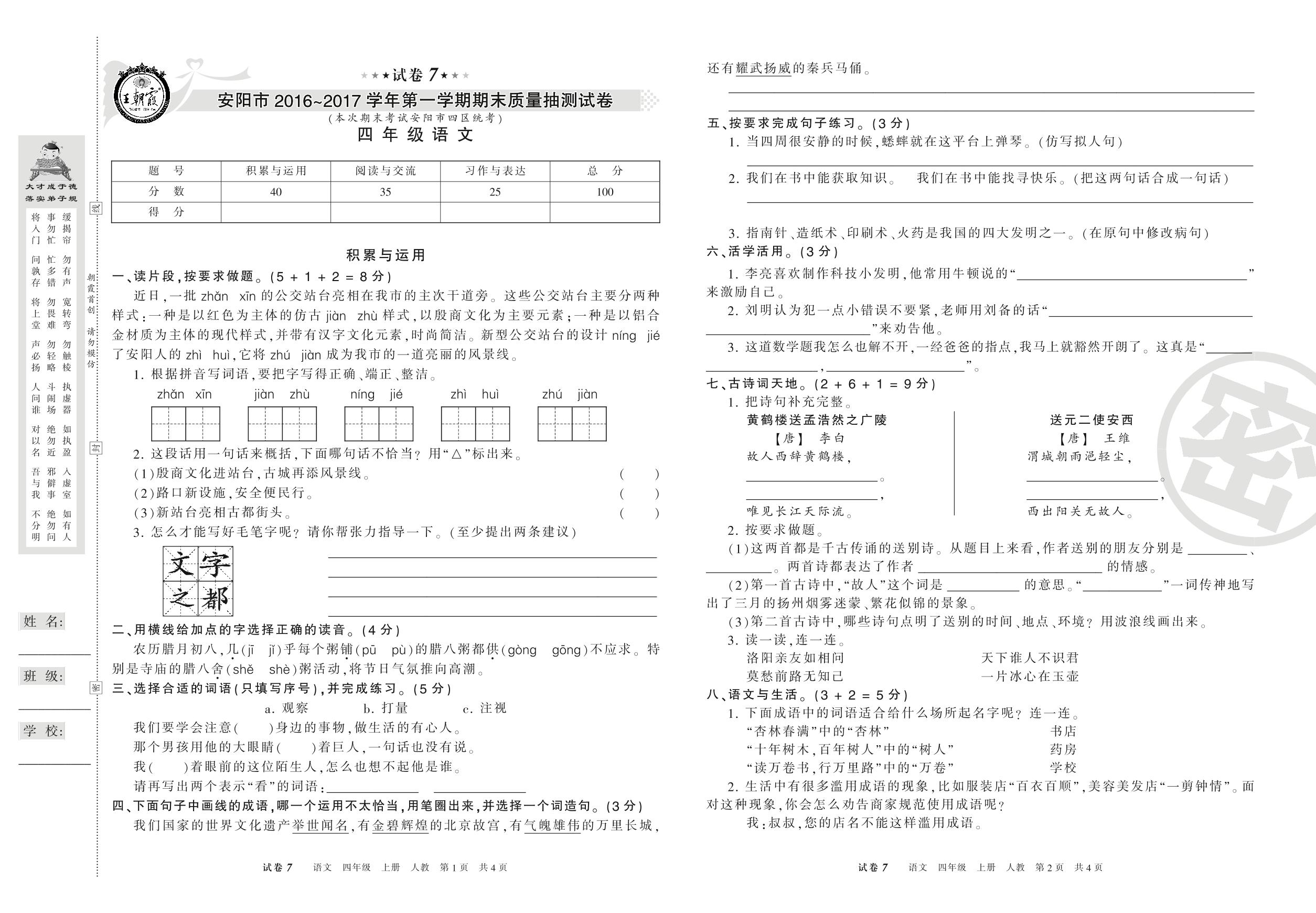 2016-2017学年第一学期安阳市四年级语文试卷(人教版)【7】