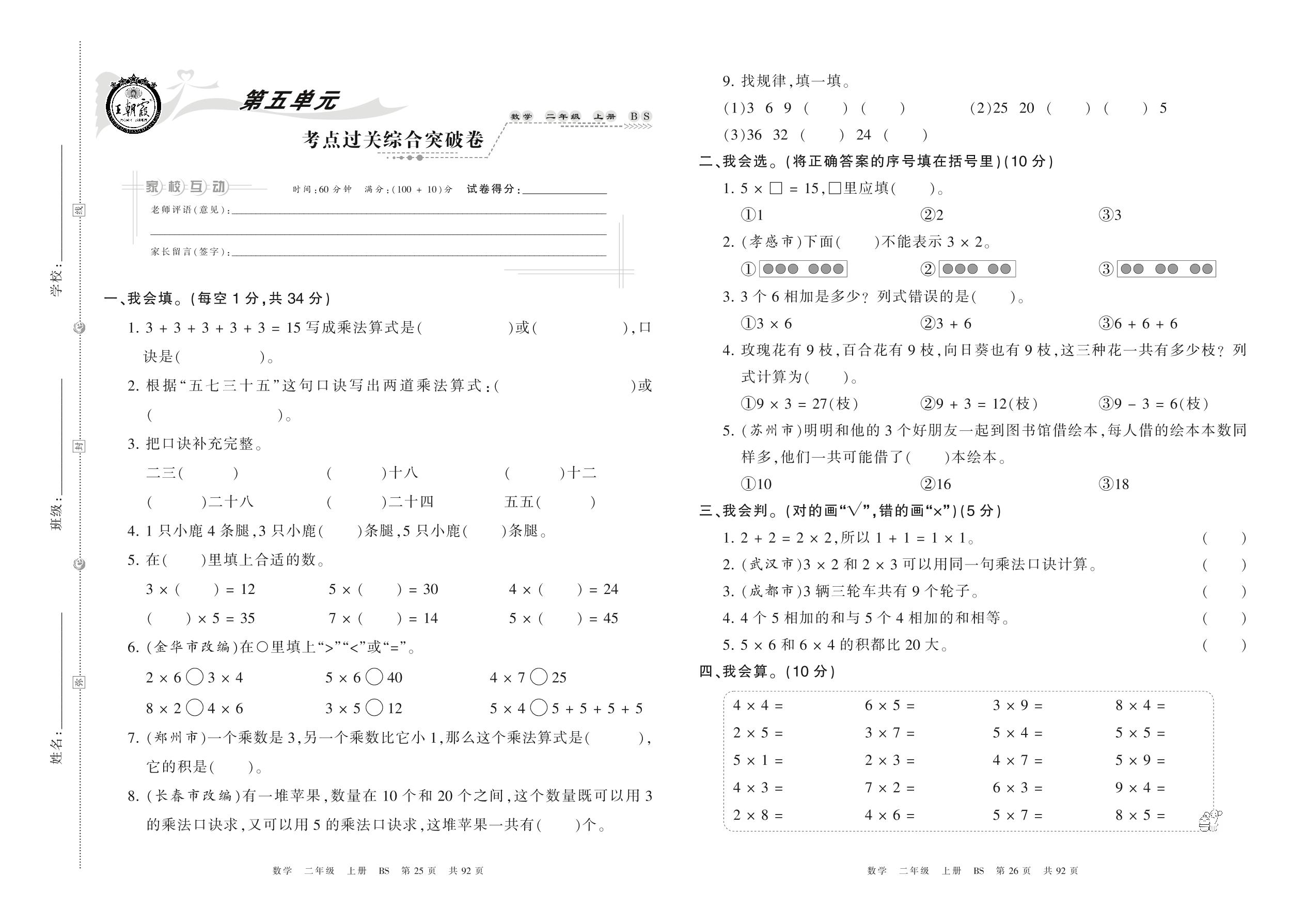 2021上册二年级数学北师版 第五单元 考点过关综合突破卷
