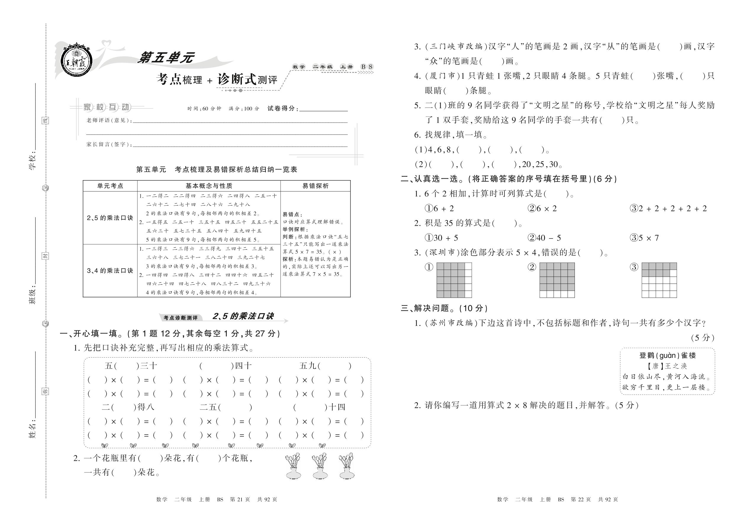 2021上册二年级数学北师版 第五单元 考点梳理+诊断式测评