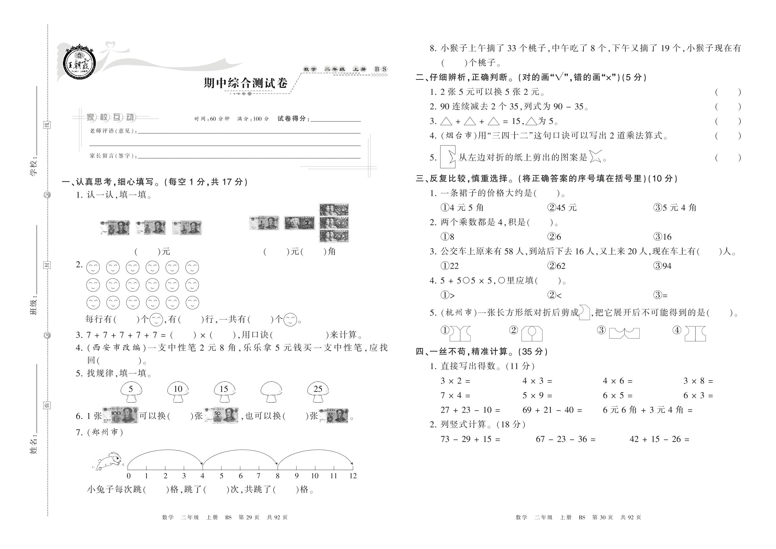 2021上册二年级数学北师版 期中综合测试卷