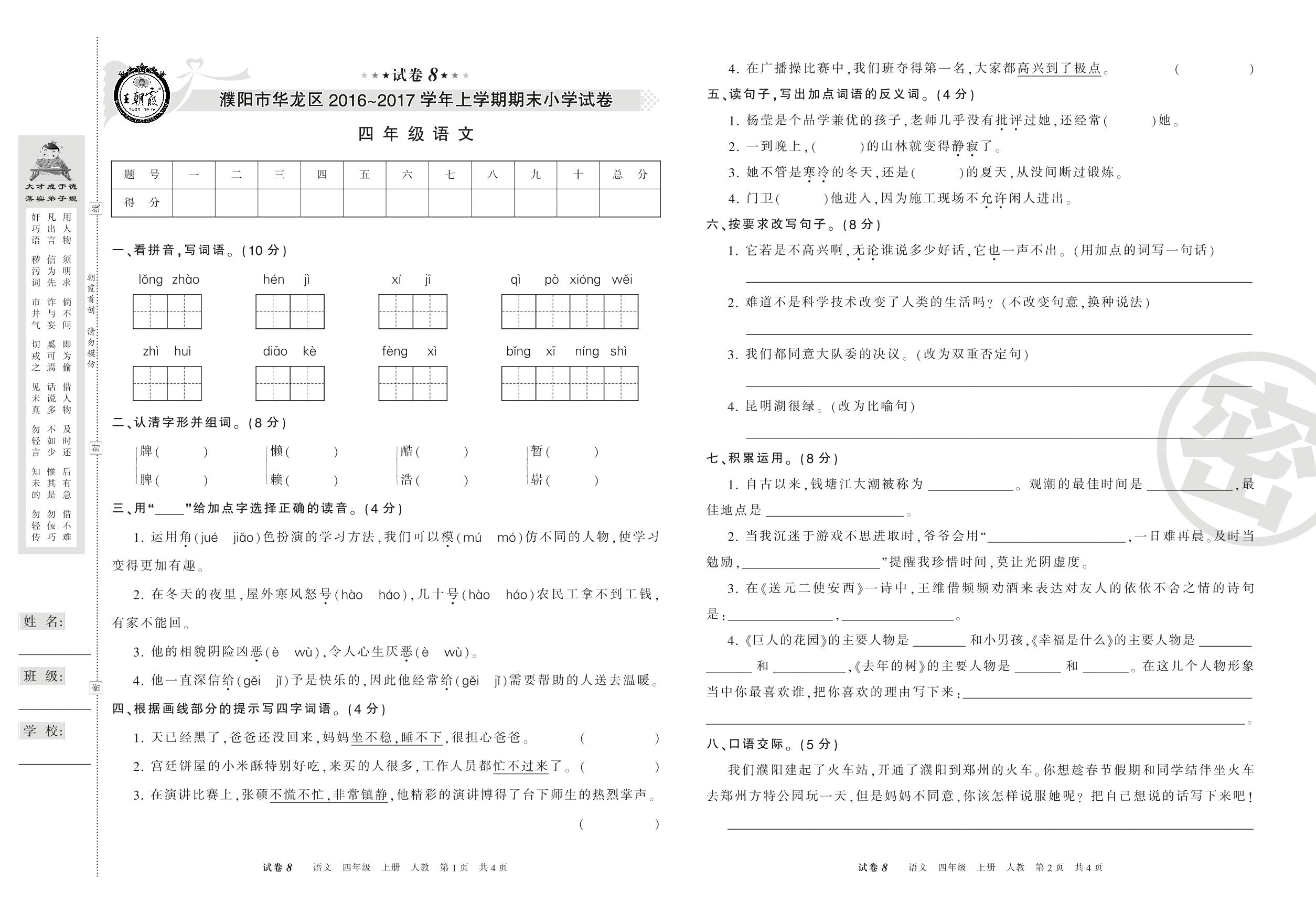 2016-2017学年第一学期濮阳市华龙区四年级语文试卷(人教版)【8】