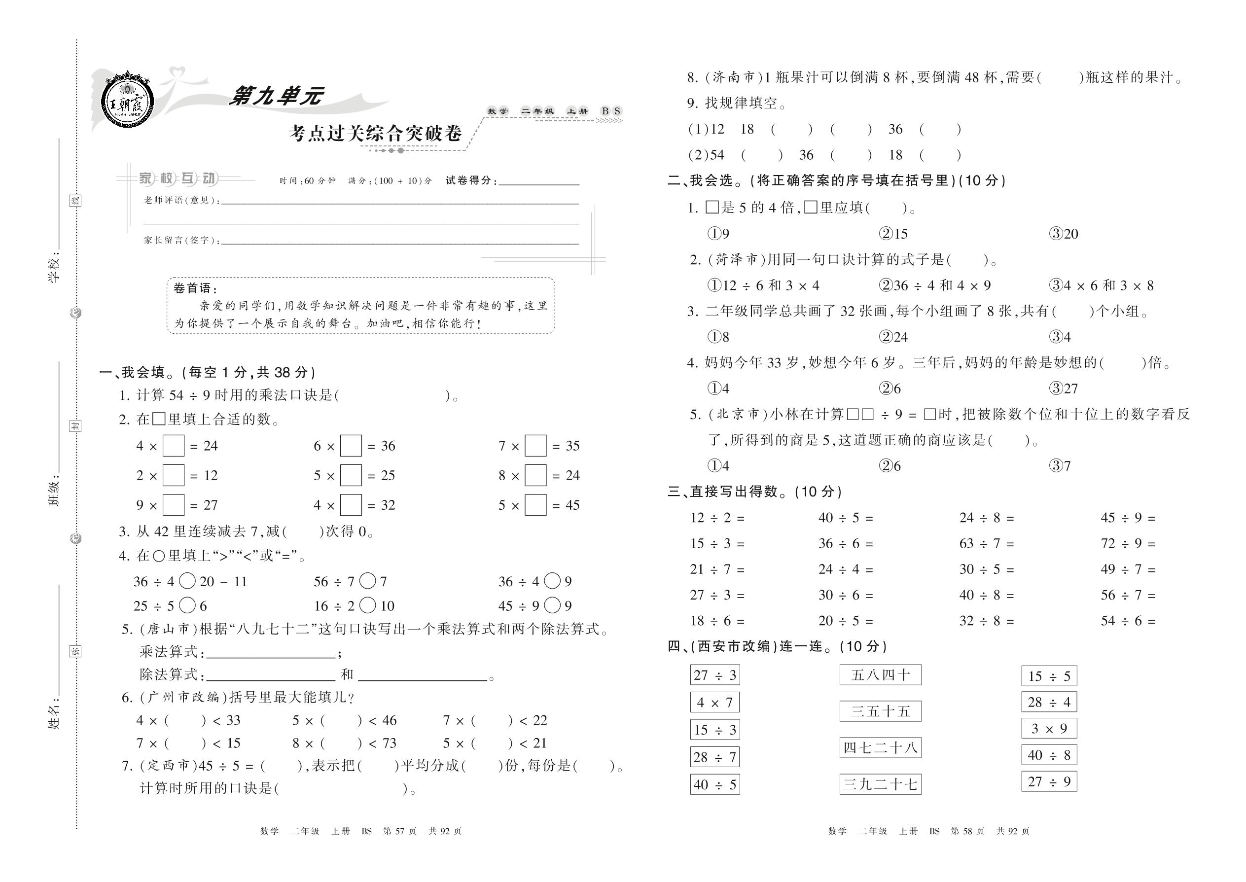 2021上册二年级数学北师版 第九单元 考点过关综合突破卷