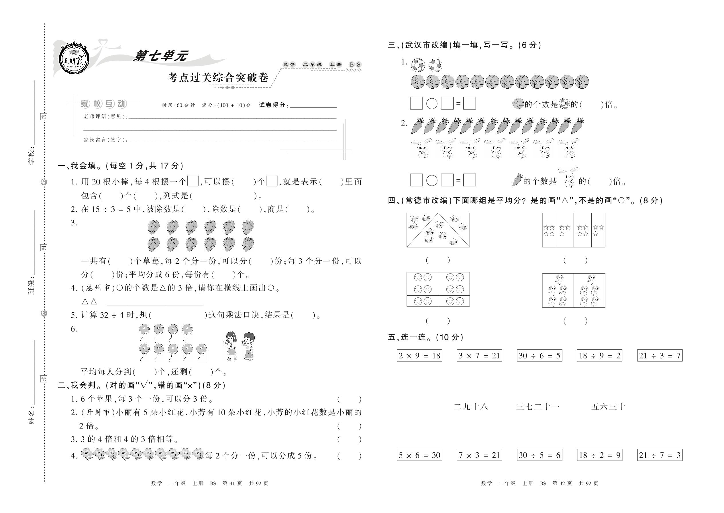2021上册二年级数学北师版 第七单元 考点过关综合突破卷