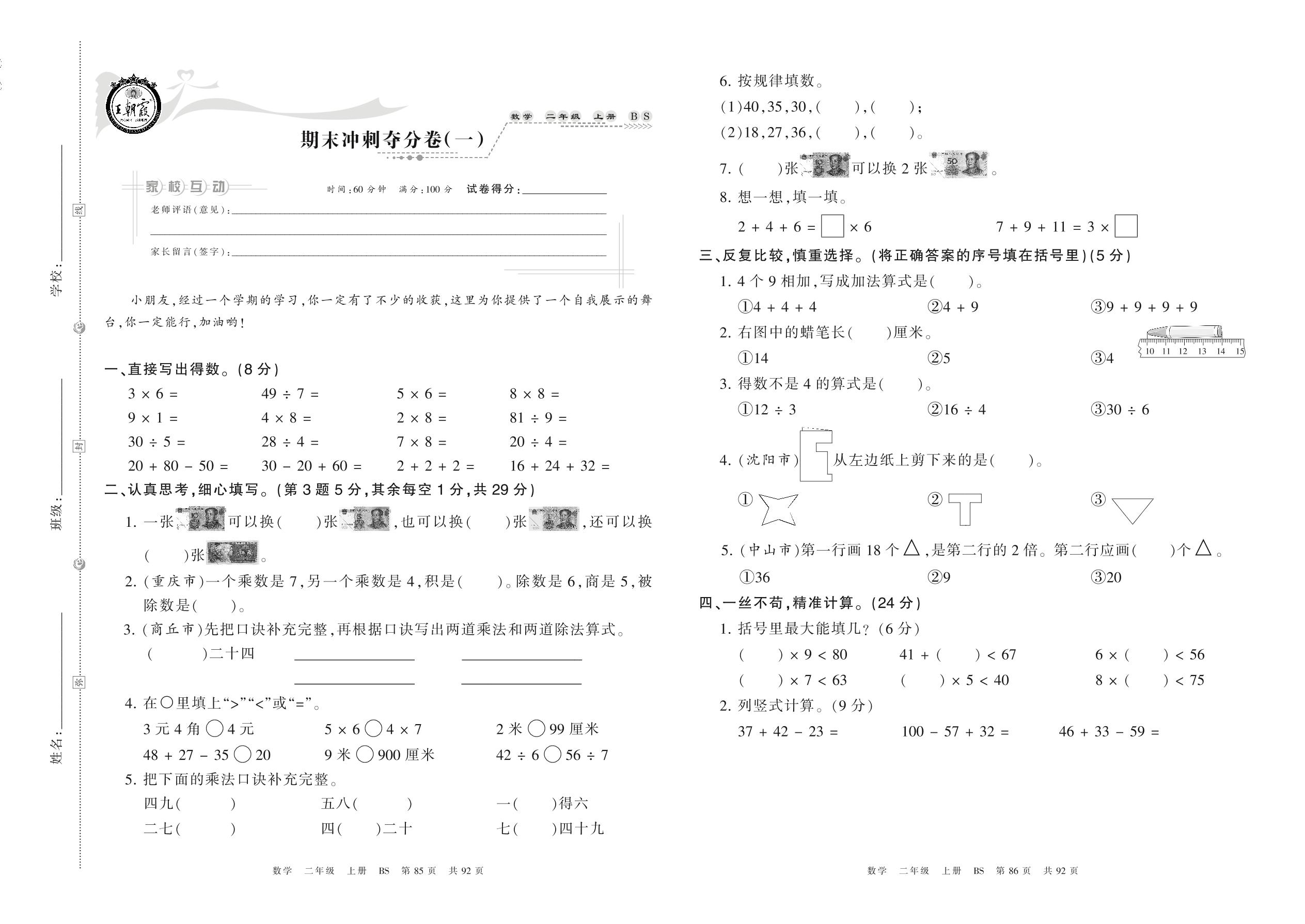 2021上册二年级数学北师版 期末冲刺夺分卷(一)