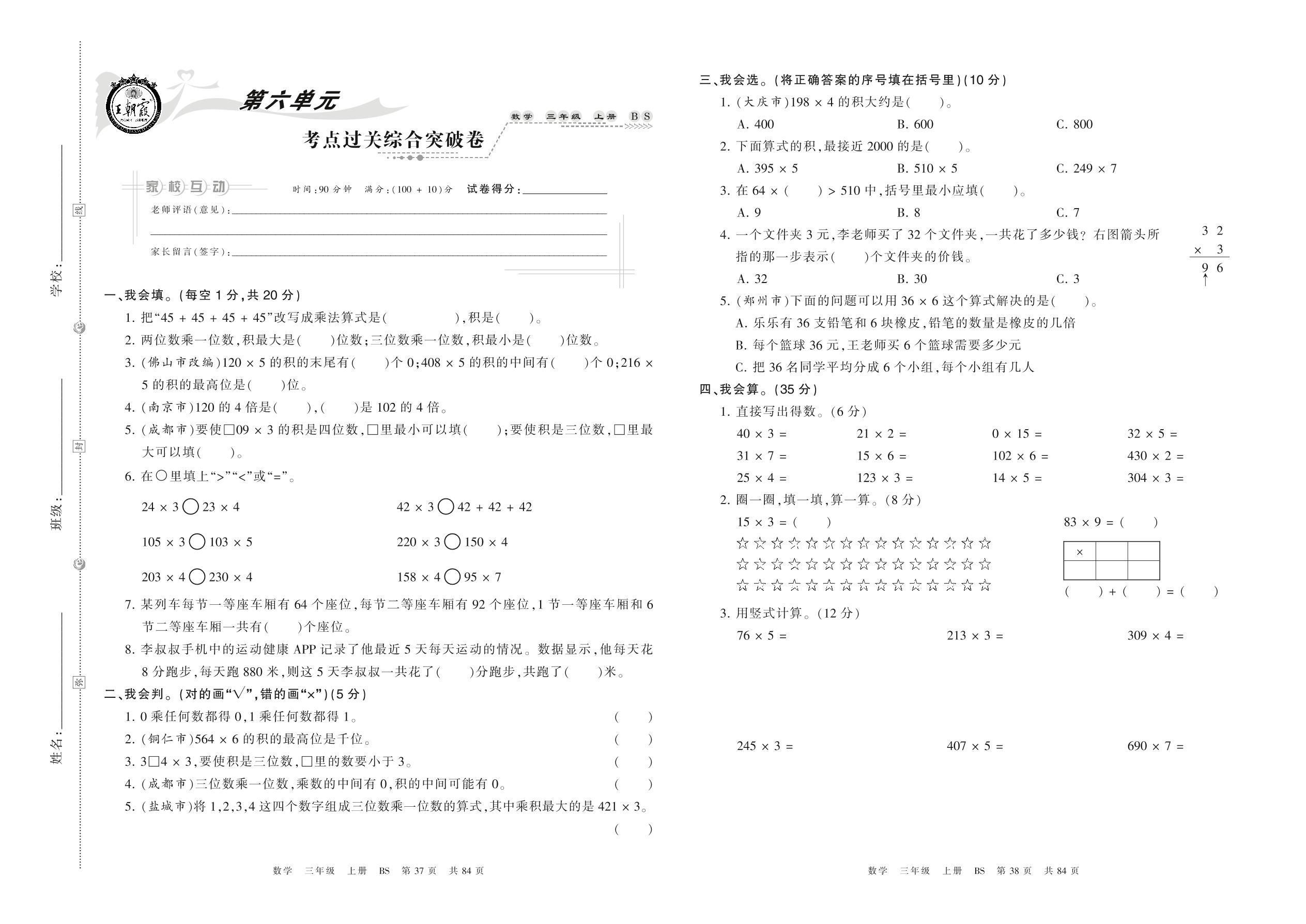 2021上册三年级数学北师版 第六单元 考点过关综合突破卷