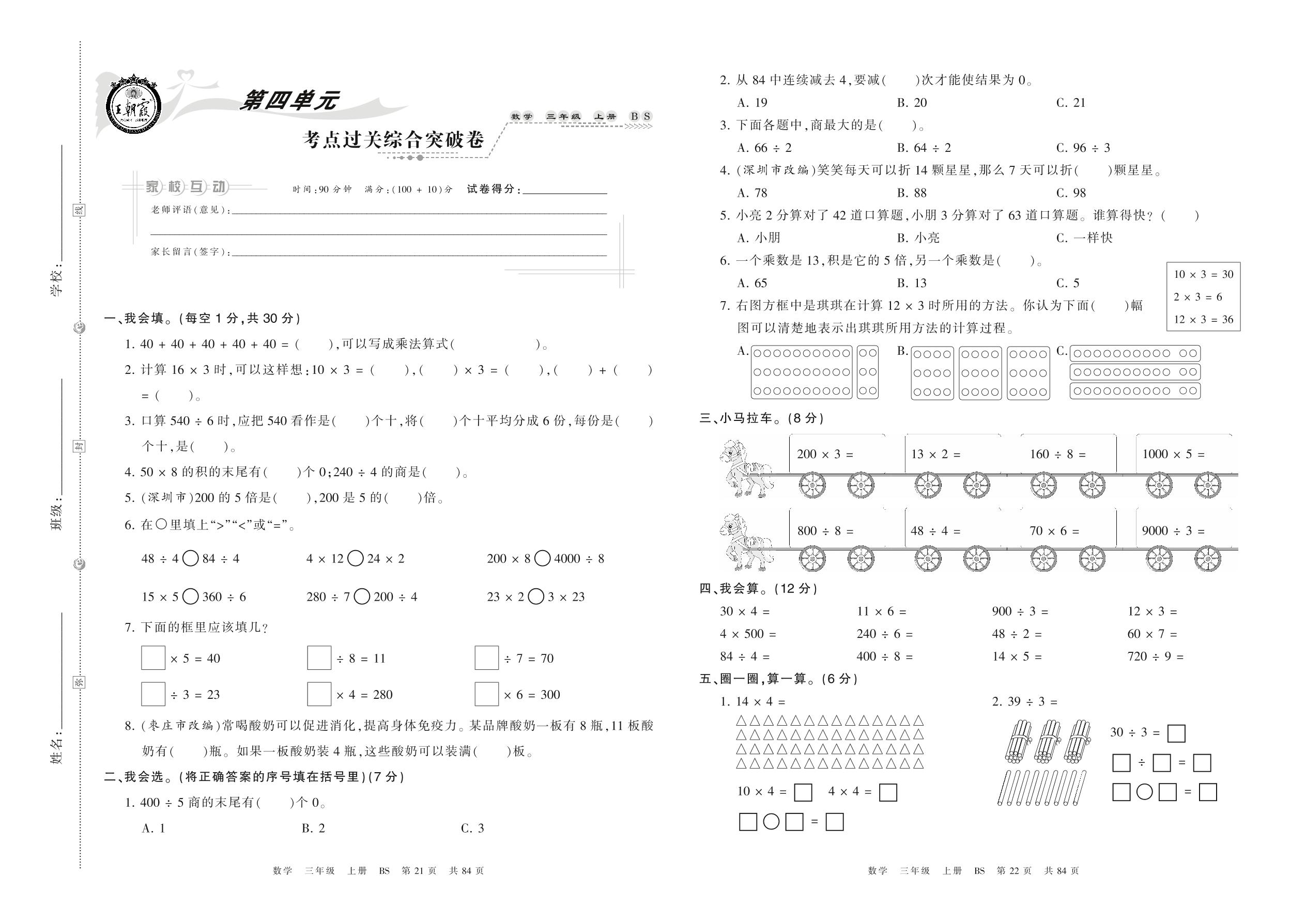 2021上册三年级数学北师版 第四单元 考点过关综合突破卷