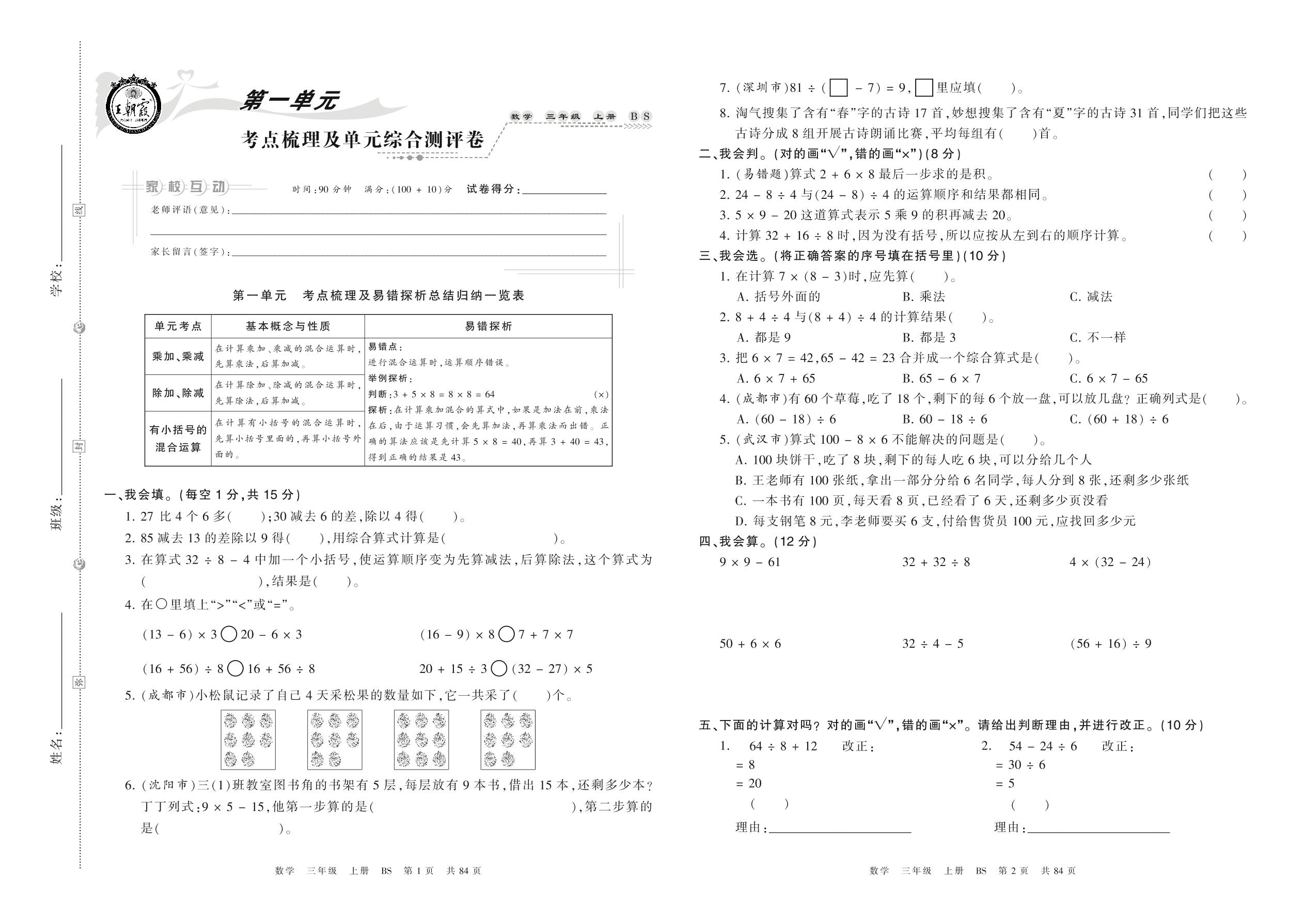 2021上册三年级数学北师版 第一单元 考点梳理及单元综合测评卷