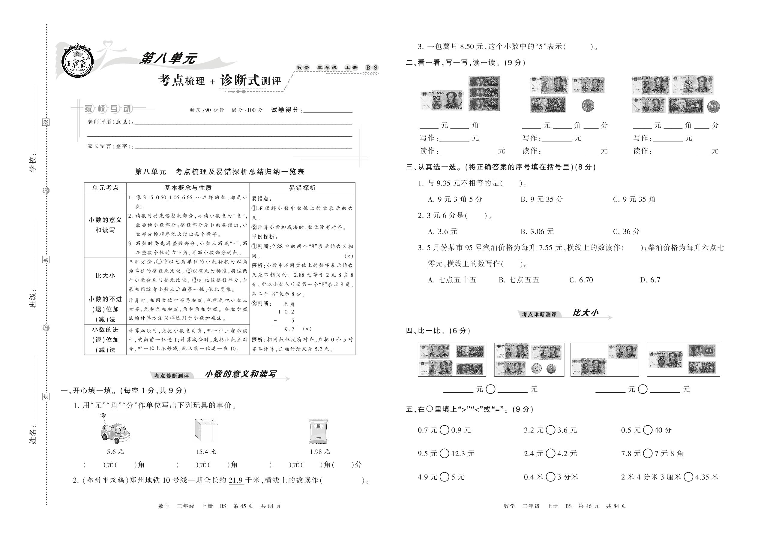 2021上册三年级数学北师版 第八单元 考点梳理 + 诊断式测评
